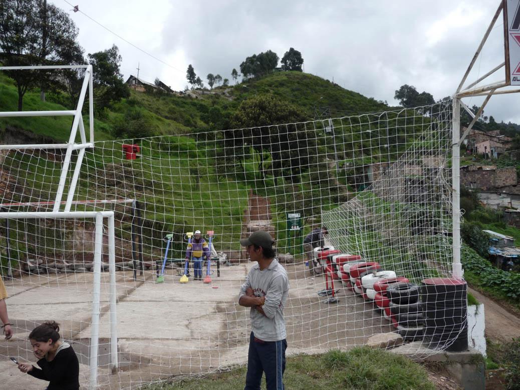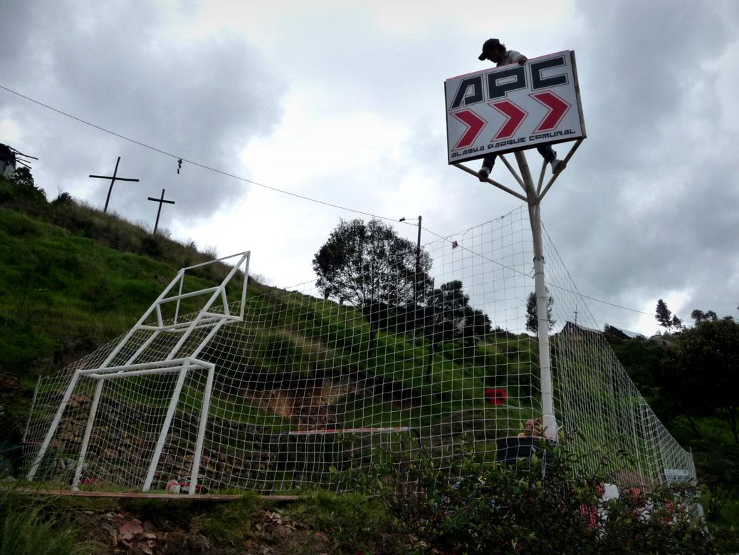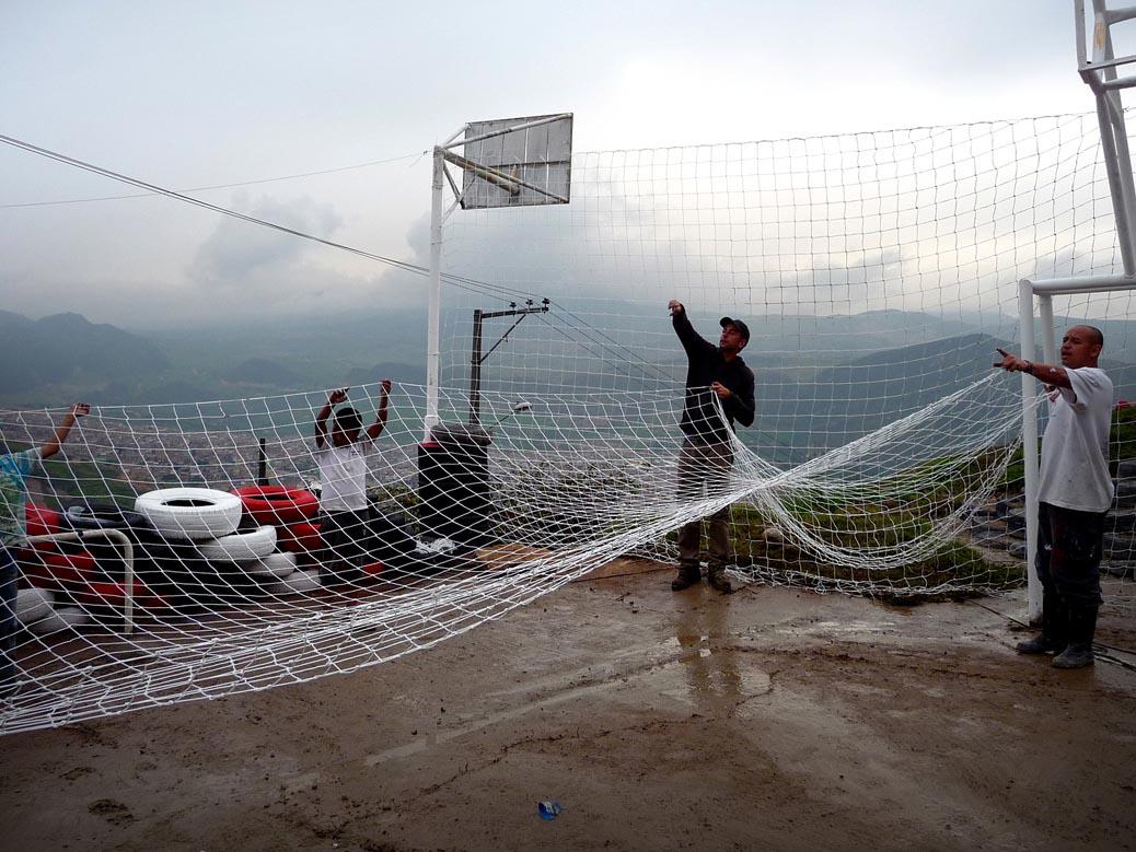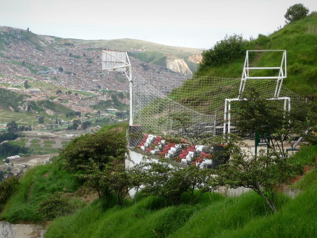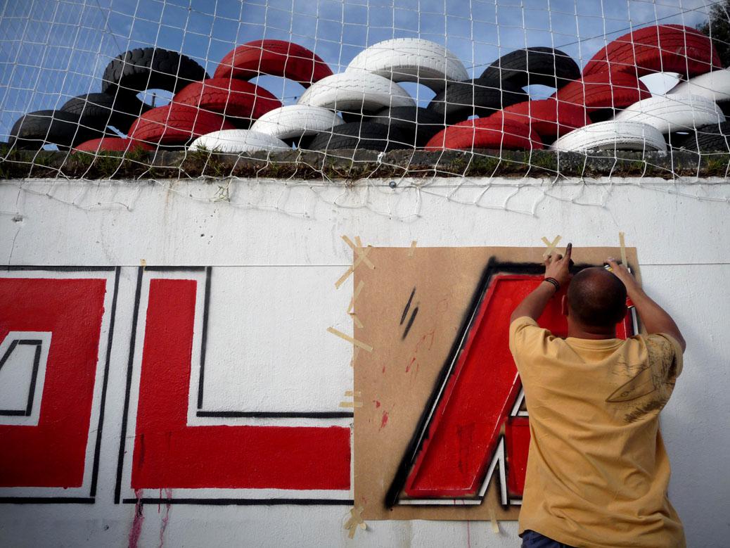 La intervención pretende no solo resolver unas cuestiones básicas de uso (la grada, la red, la baranda), sino aportar un componente de alto contenido simbólico con una gráfica muy contundente y el derecho a ser visto y reconocido, a través del uso de las letras sobre la colina como táctica de visibilidad.