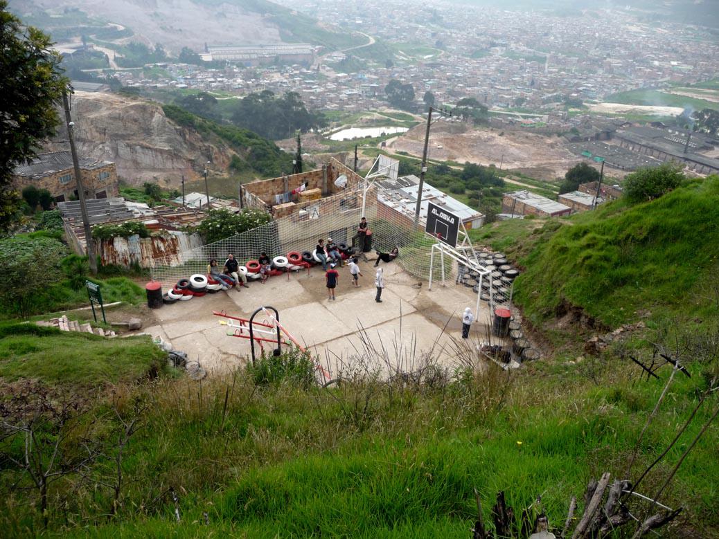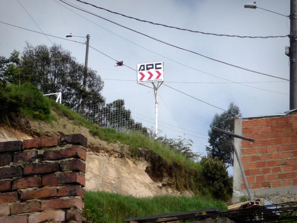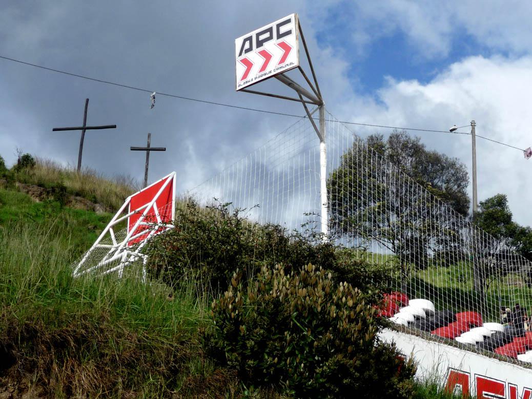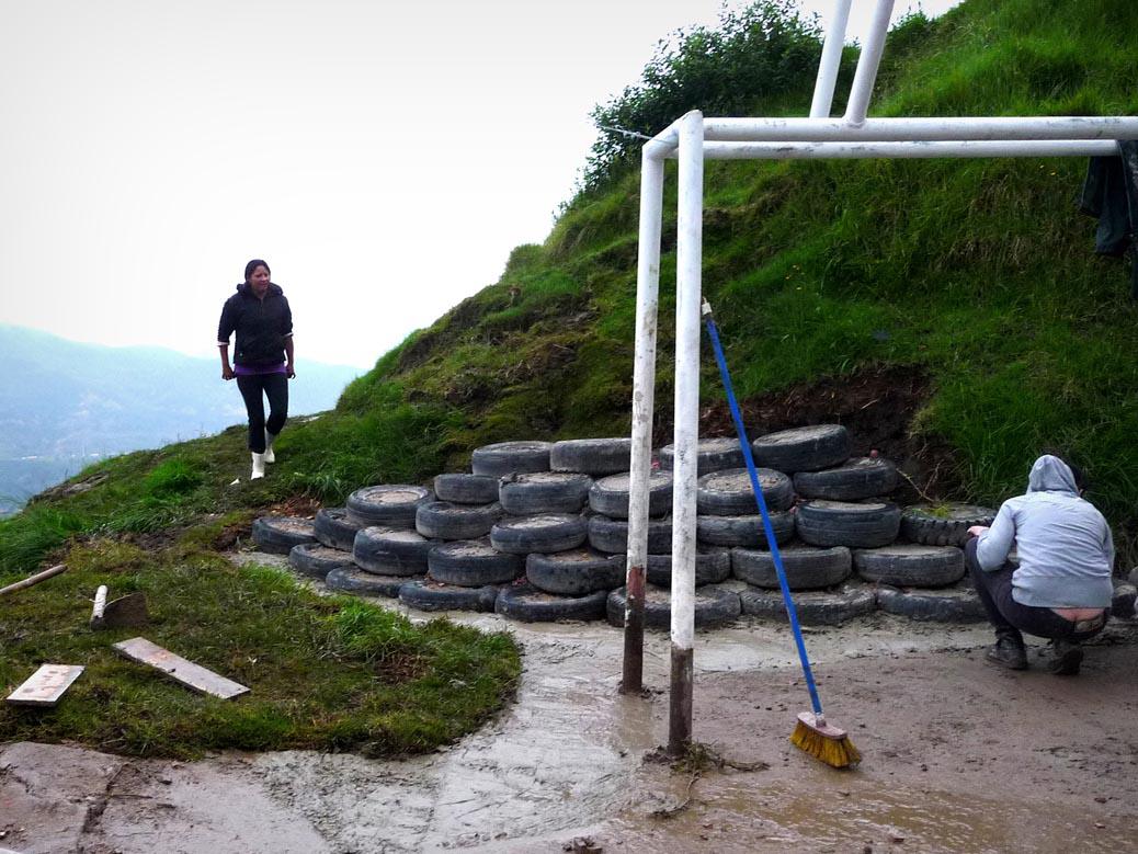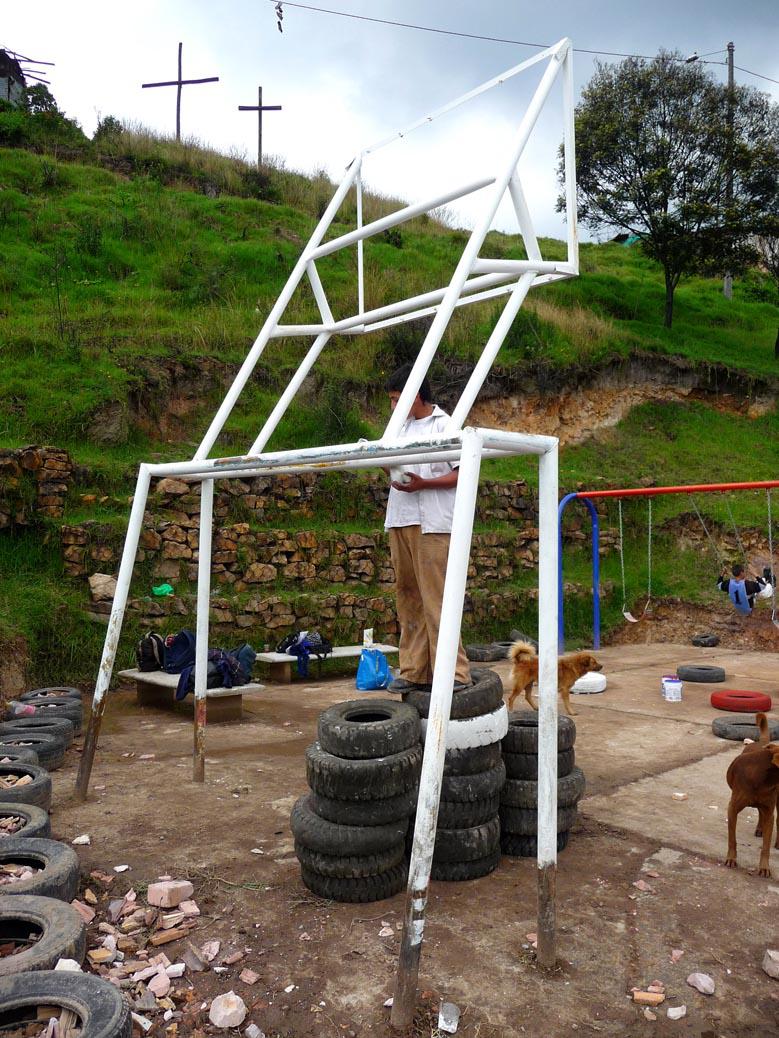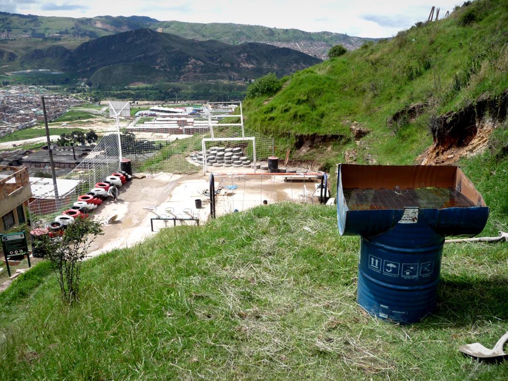 La intervención pretende no solo resolver unas cuestiones básicas de uso (la grada, la red, la baranda), sino aportar un componente de alto contenido simbólico con una gráfica muy contundente y el derecho a ser visto y reconocido, a través del uso de las letras sobre la colina como táctica de visibilidad.