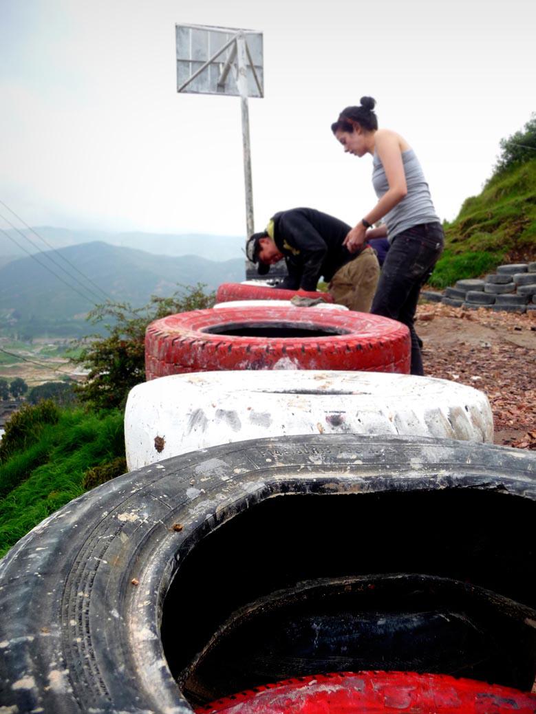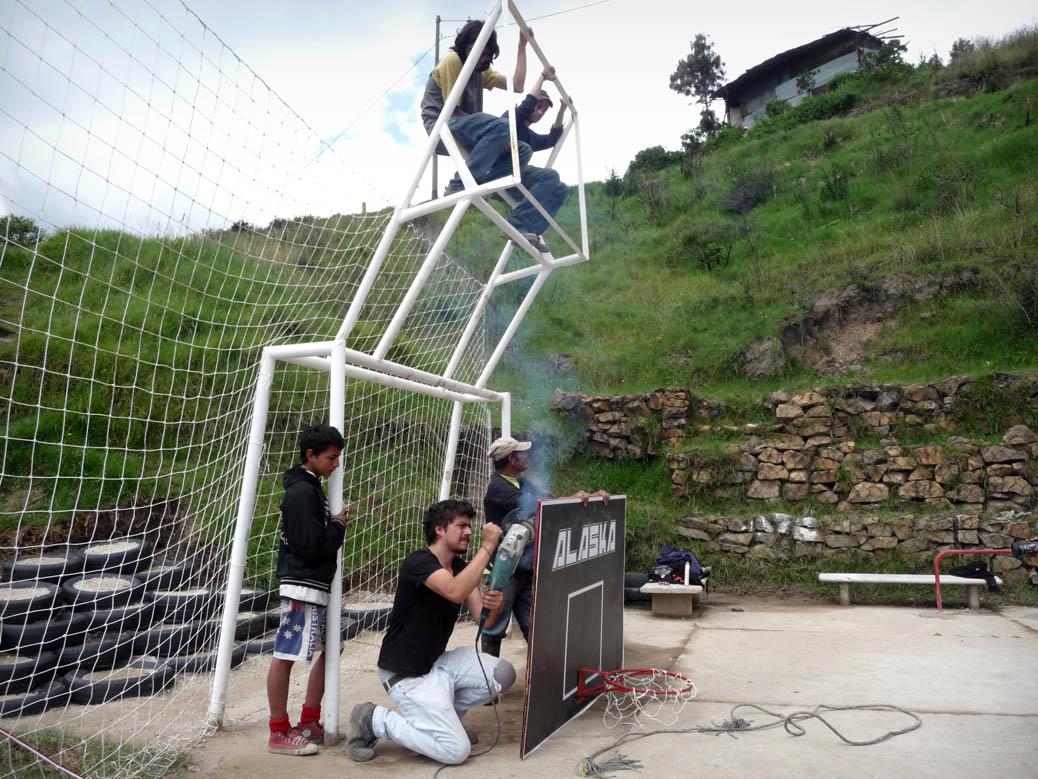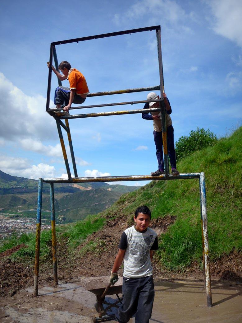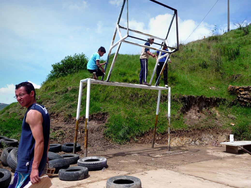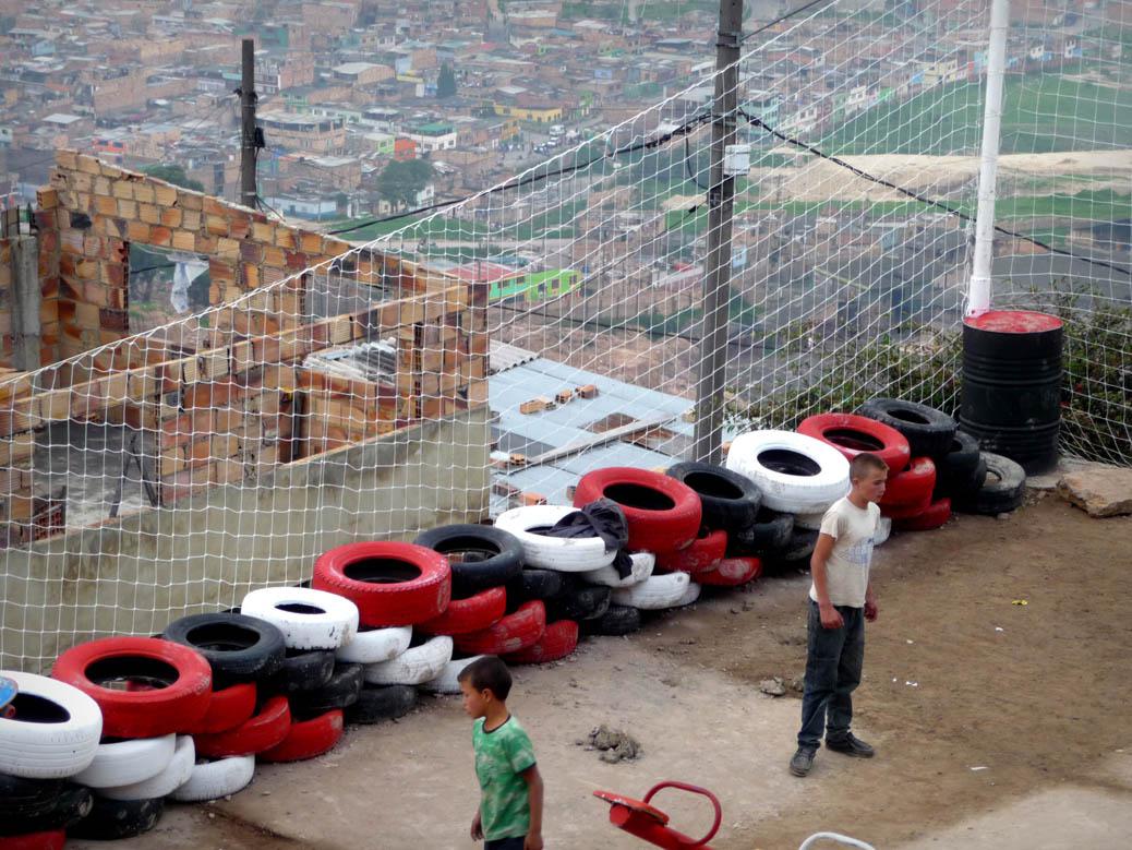 La intervención pretende no solo resolver unas cuestiones básicas de uso (la grada, la red, la baranda), sino aportar un componente de alto contenido simbólico con una gráfica muy contundente y el derecho a ser visto y reconocido, a través del uso de las letras sobre la colina como táctica de visibilidad.