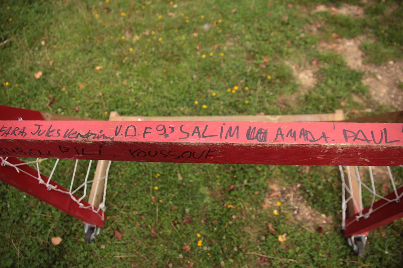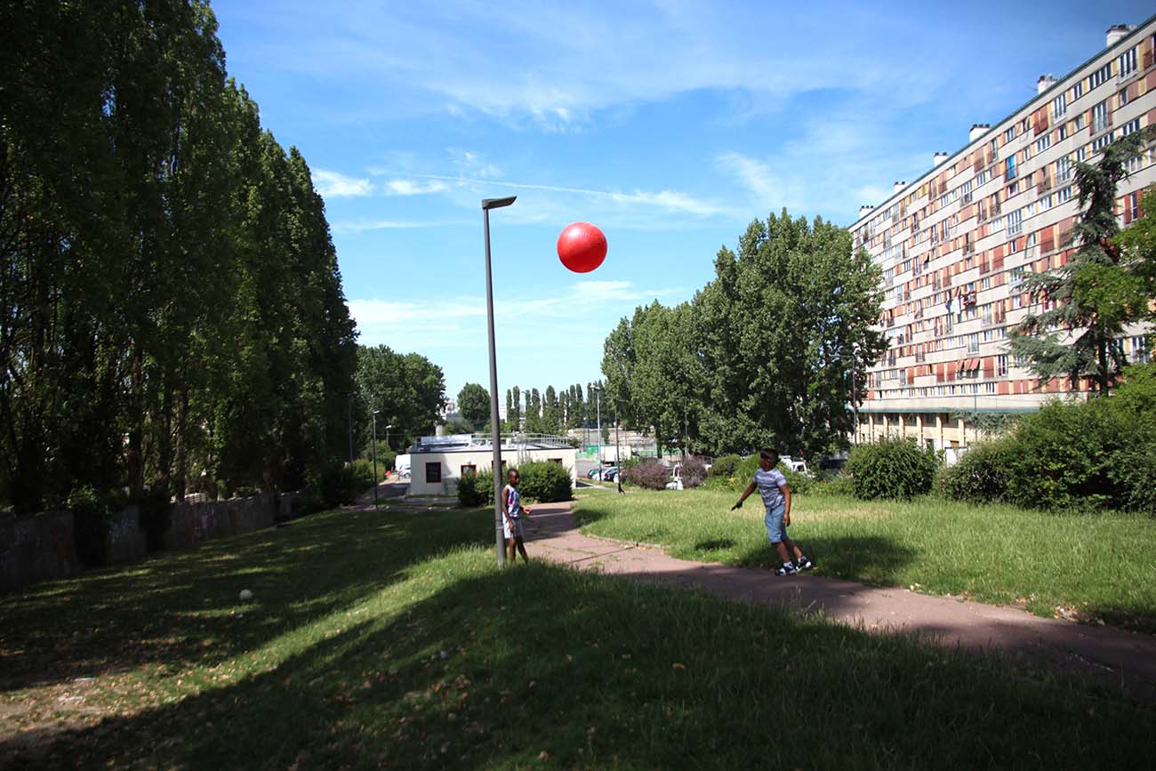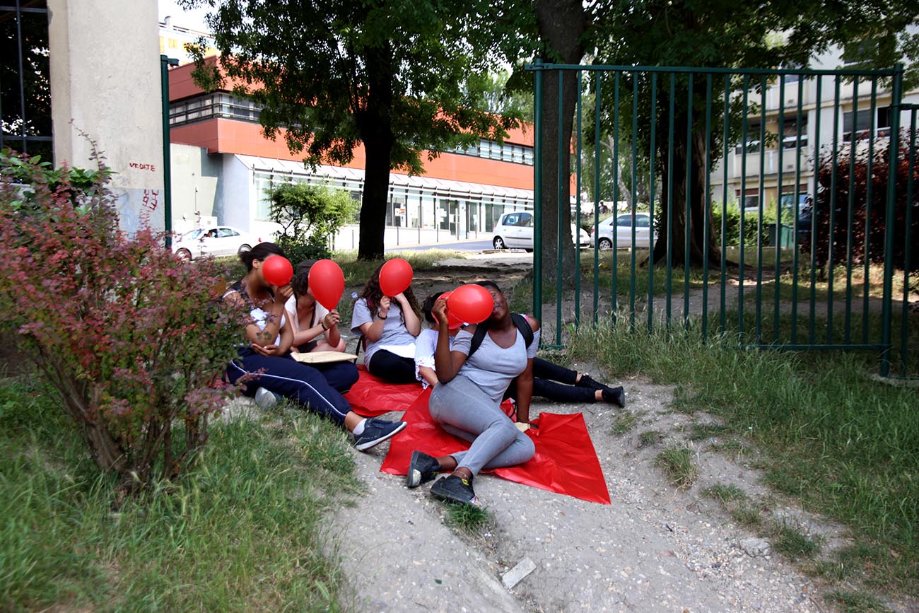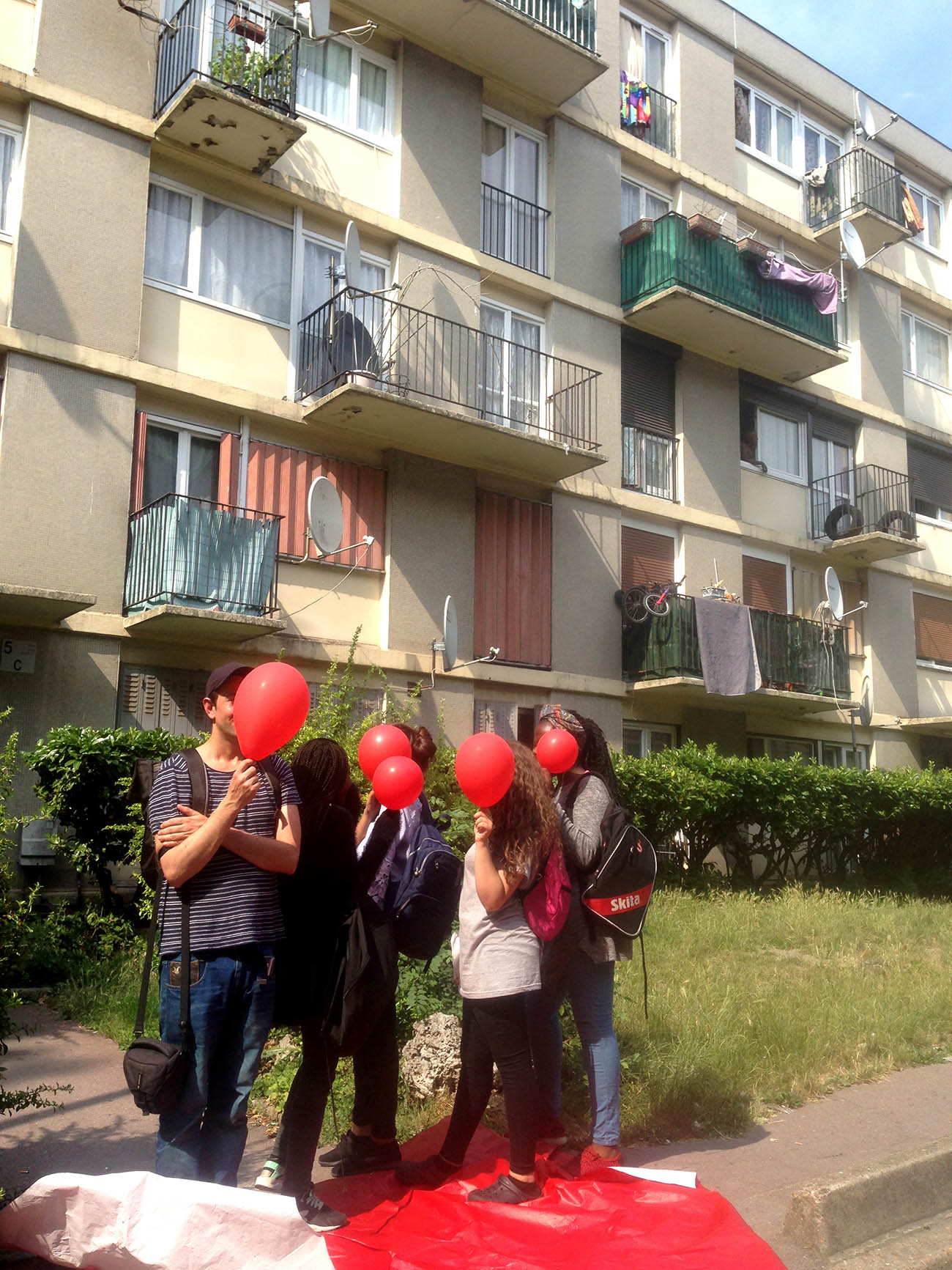 La estrategia de color aportaba un alto contenido simbólico a la intervención, reconocible fácilmente, lo que generaba cierto grado de especulación en las conversaciones vecinales en torno a lo que estaba pasando en el barrio. El rojo vino dado por el descubrimiento –en un taller de deriva colectiva- de la escultura del “ballon rouge”-en referencia a la película de Albert Lamorisse, que reposa sobre el colegio Louise Michel, en la que también se puede leer el verso de su poema: “Il me faut, comme á toi, l’air et la liberté” (me hace falta, como a tí, el aire y la libertad)
