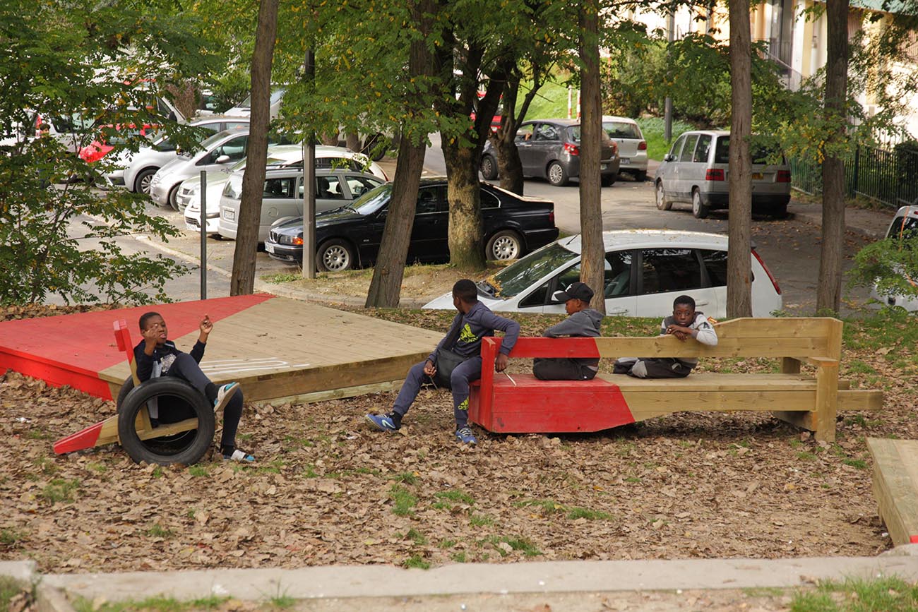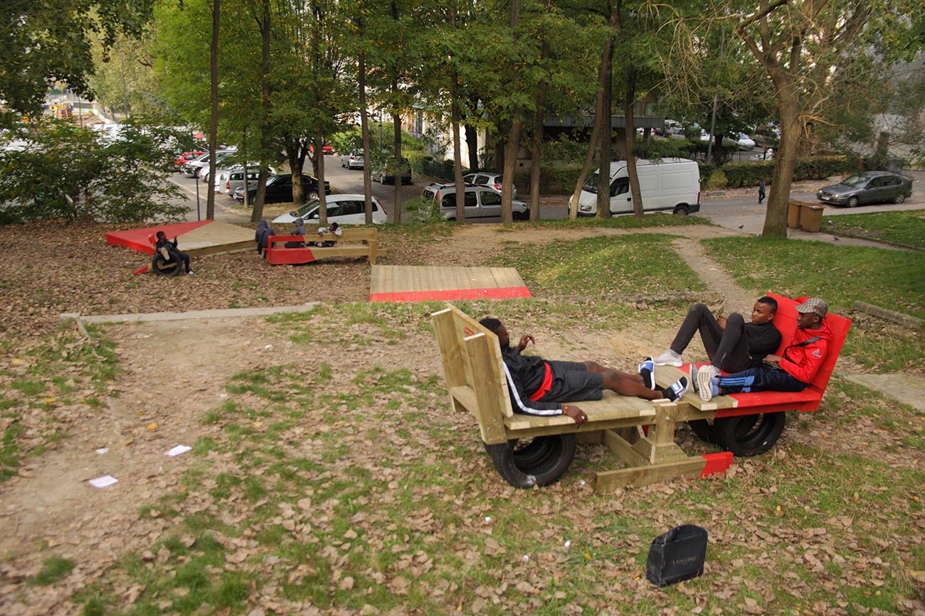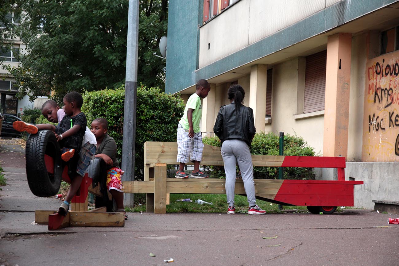 La estrategia de proyecto -que además nos debía permitir aproximarnos al contexto y legitimar nuestra presencia constante allí- no reposaba esencialmente sobre el diseño formal de los espacios públicos, sino en lo que llamamos “provocaciones tácticas”: mobiliarios móviles que nos permitían “tomar la temperatura”, documentar su movilidad y las reacciones -a través del dibujo cartográfico y de historietas, comics o bande dessiné- de los distintos agentes urbanos: vecinos, organizaciones, instituciones, niños, etc.