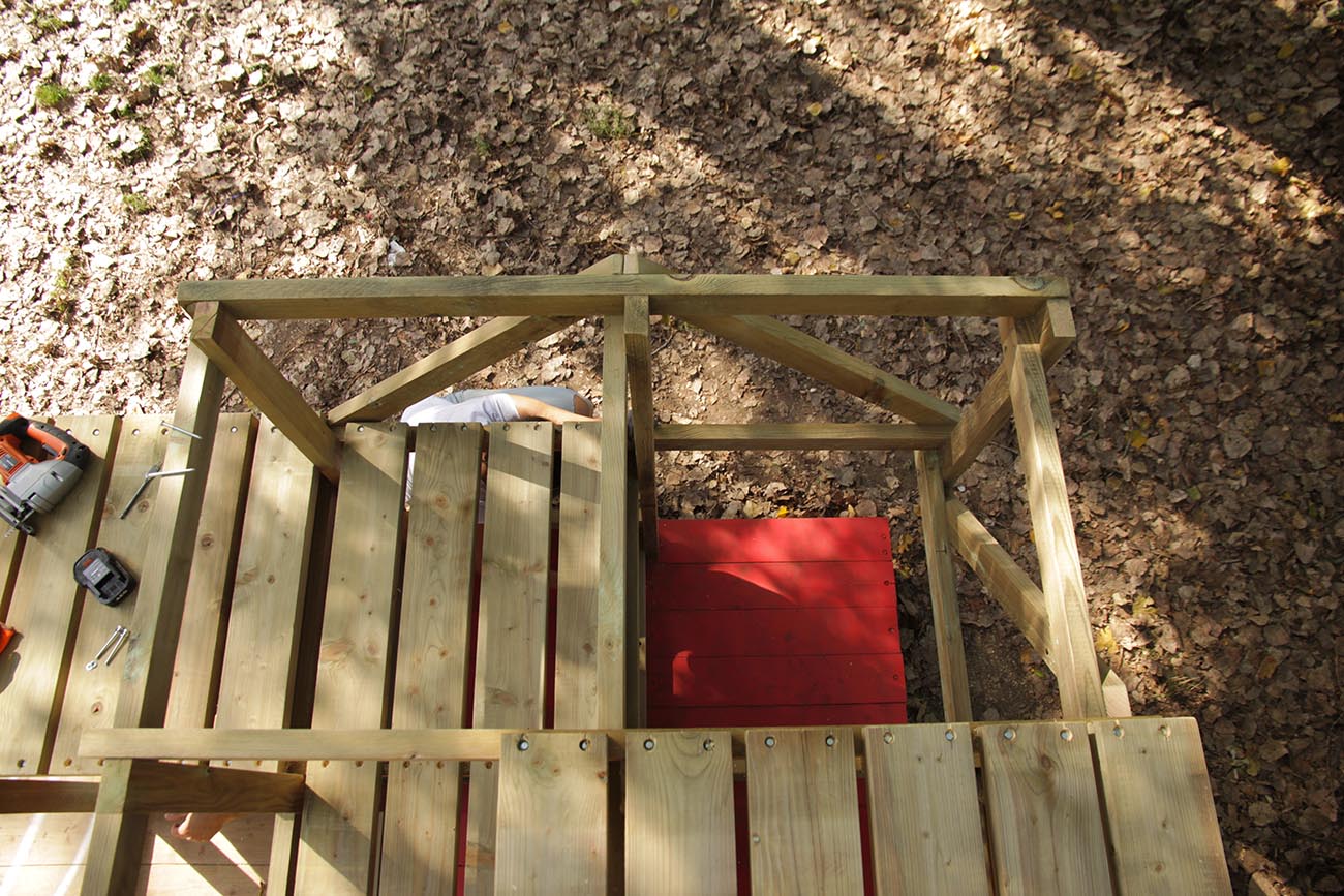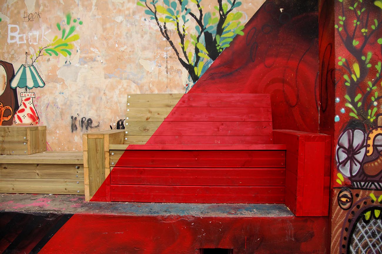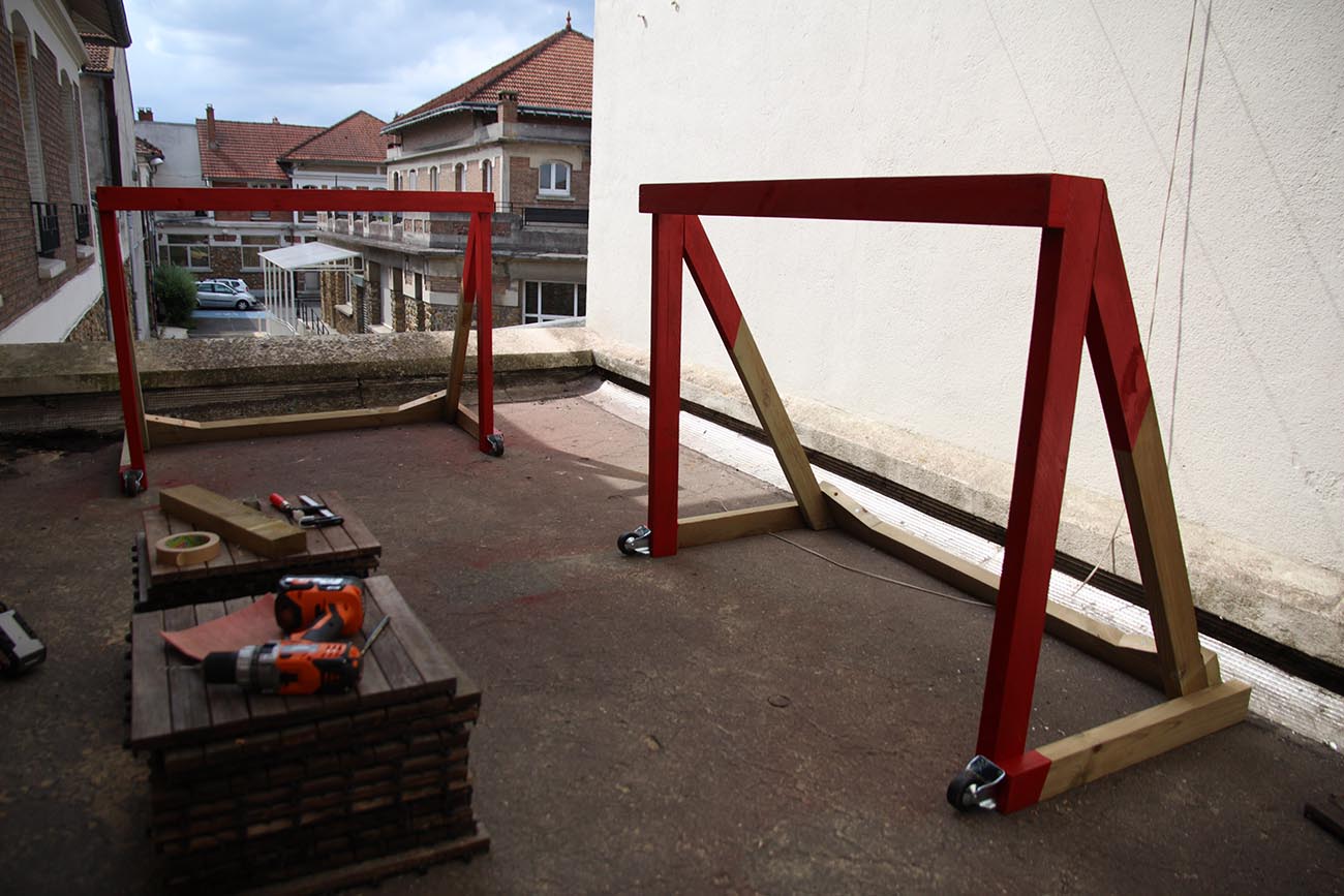 Aunque el diseño no tenía vocación de ser el punto de partida, se utilizaron algunos códigos materiales básicos: maderas tratamiento class 3 apto para exteriores de adquisición económica en almacenes muy comunes del contexto. Así mismo las herramientas necesarias para la construcción son muy básicas. El tamaño de las maderas y de ferretería se sobredimensionó vistas las condiciones del contexto. Se utilizaron algunos elementos reciclados de las basuras del contexto.