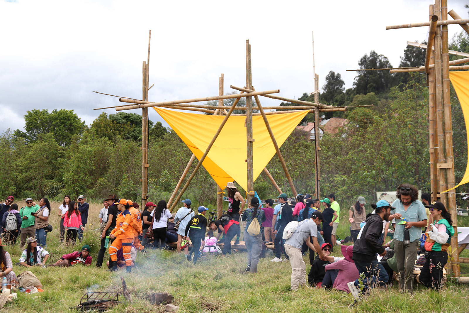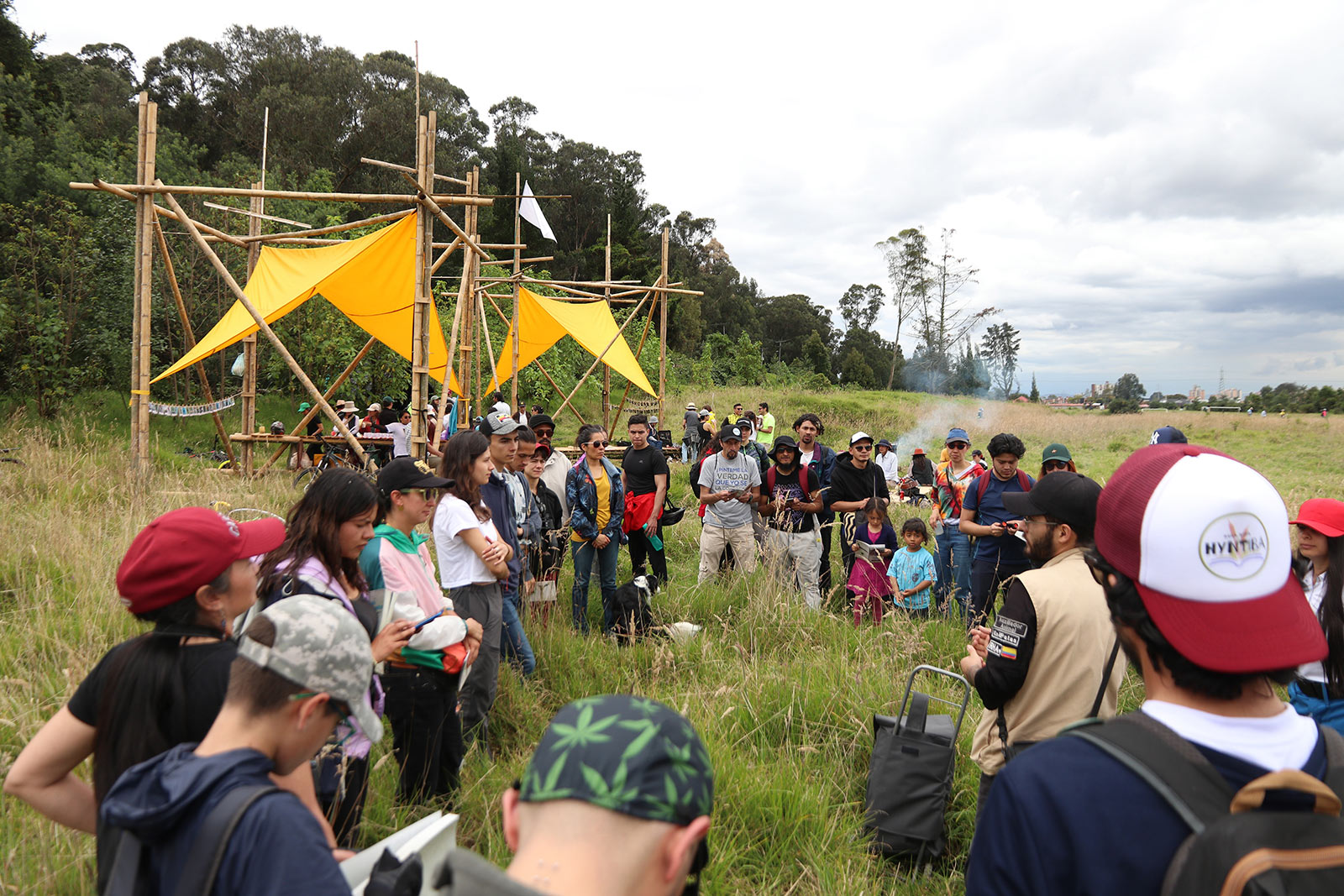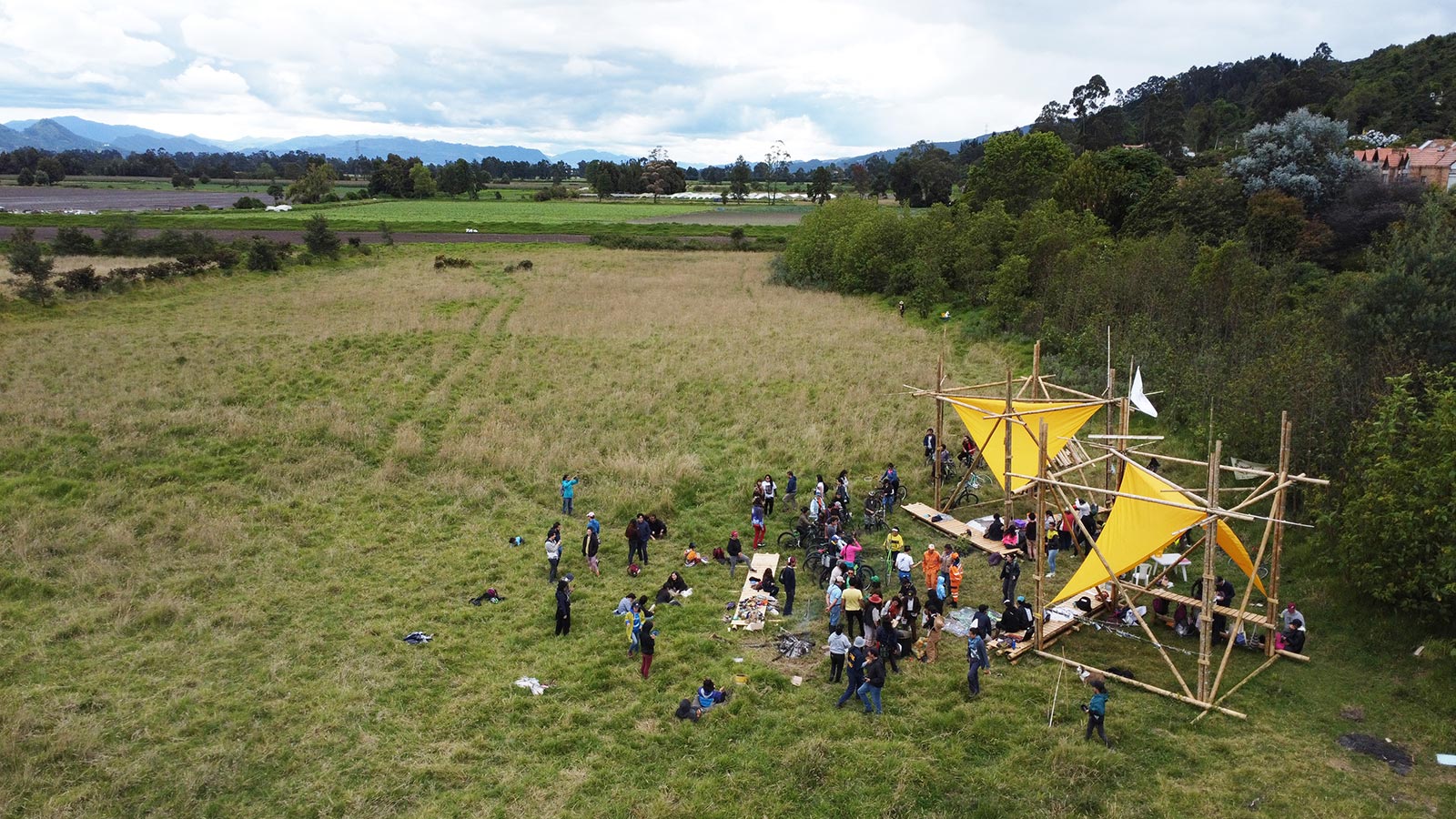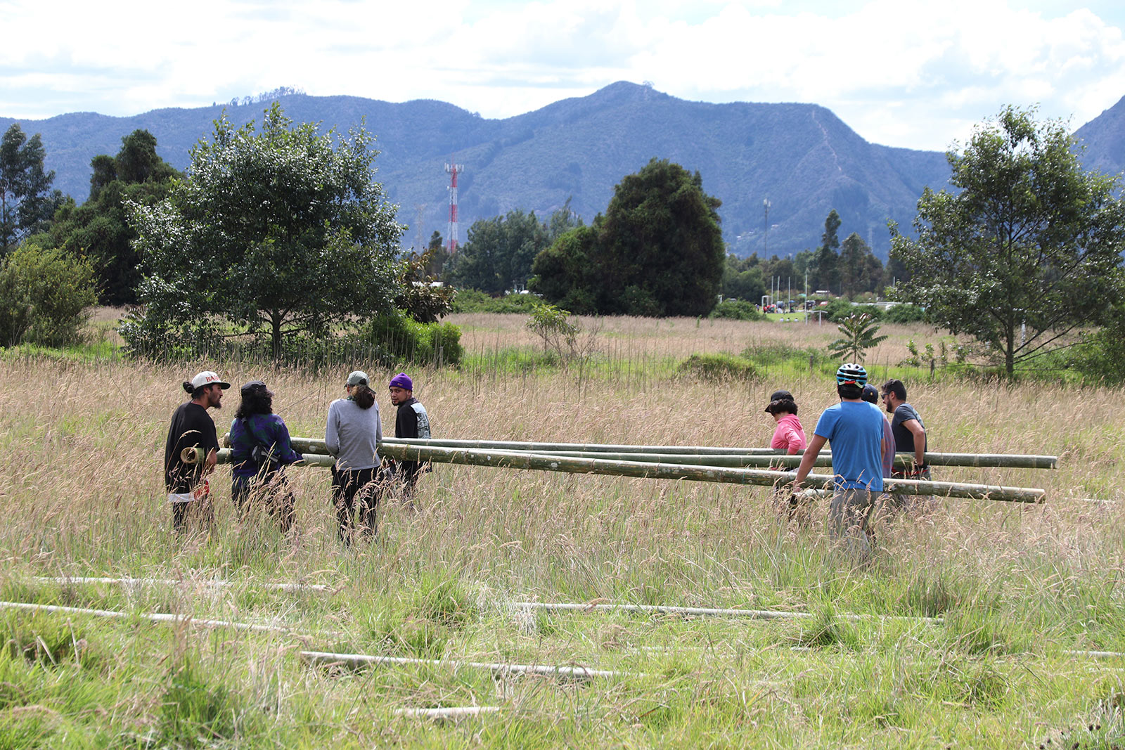Gracias al cabildo indígena muisca de Suba y la guardia indígena, fueron movidas “a pulso” y de forma colectiva, a modo de minga indígena que, en este caso, es liderada por abuela muisca que acompaña en todas las sesiones, pidiendo perdón y permiso a la tierra por nuestra presencia. La decisión sobre la ubicación final se tomó in situ, sin necesidad de adecuación previa, pues “las perchas” están directamente apoyadas sobre el suelo a modo de bien mueble (no inmueble).