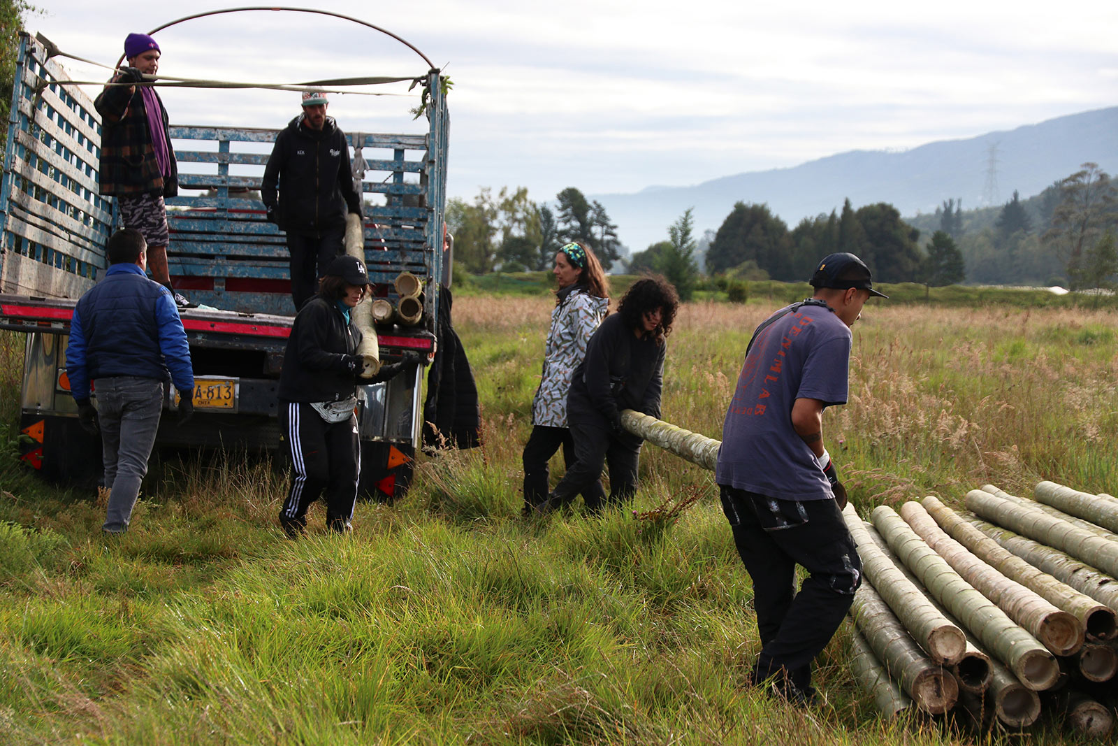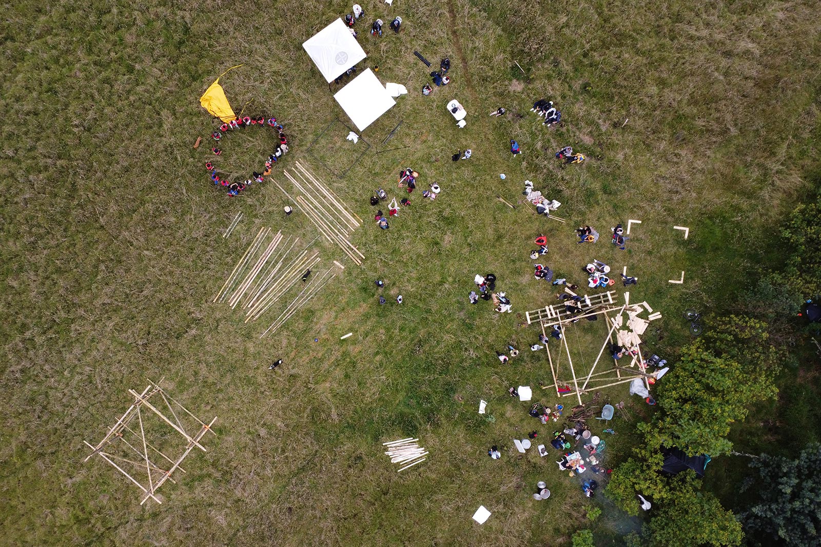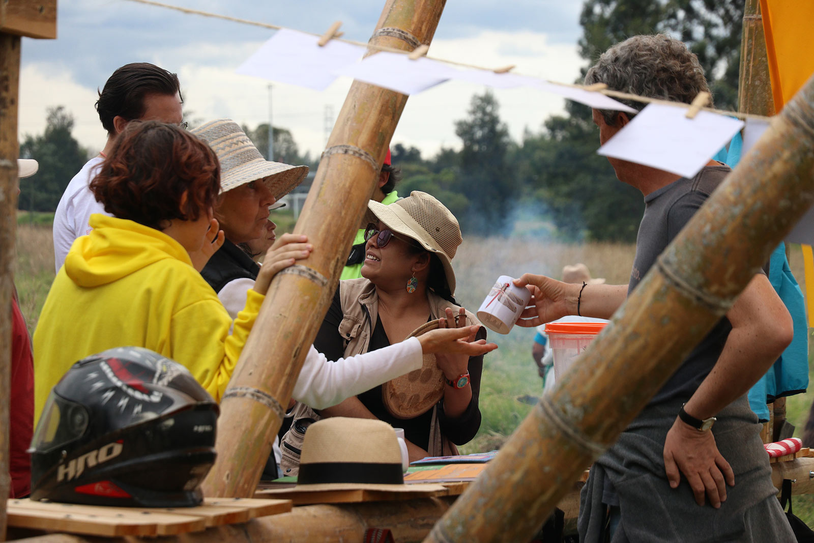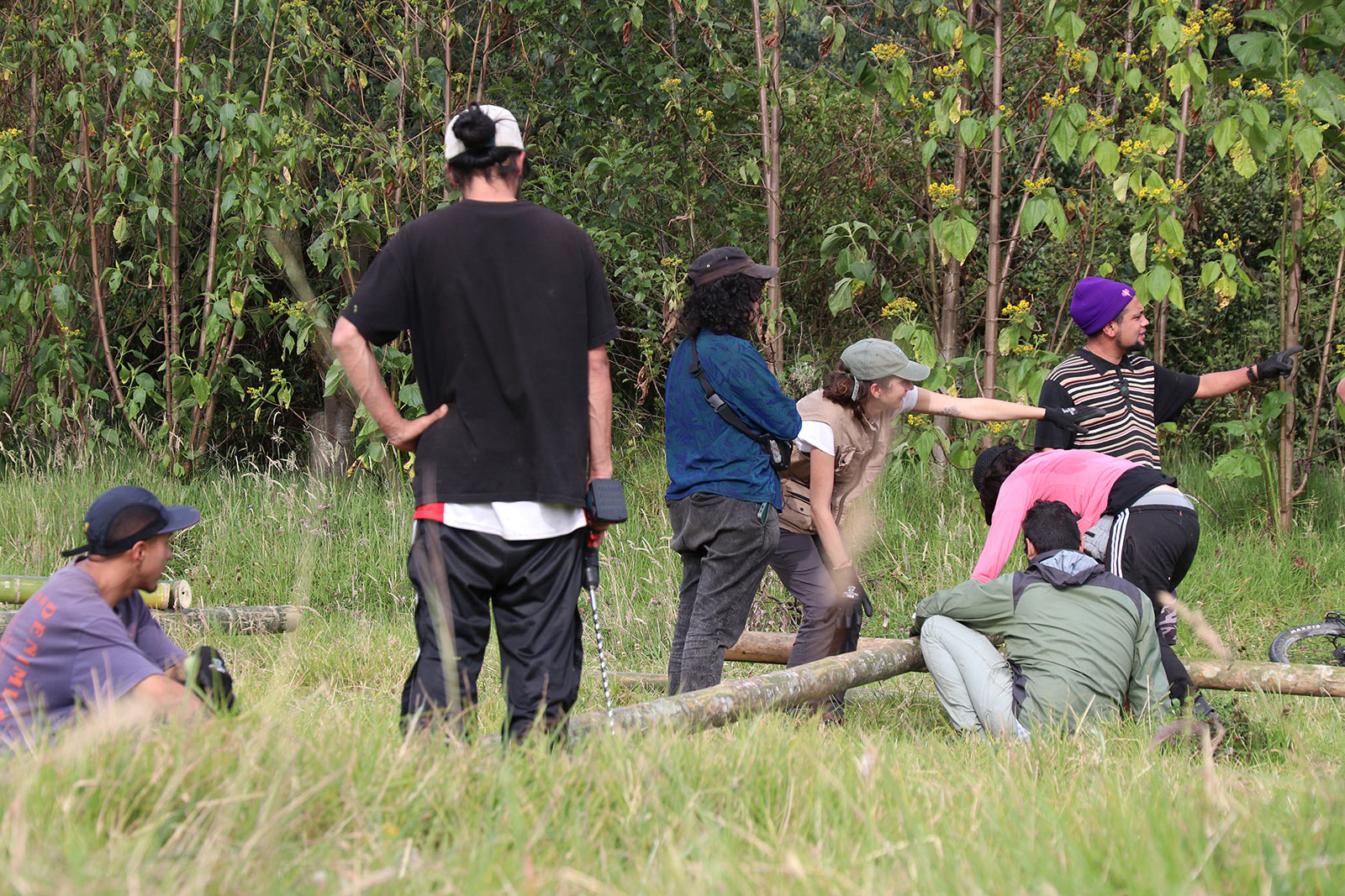 Gracias al cabildo indígena muisca de Suba y la guardia indígena, fueron movidas “a pulso” y de forma colectiva, a modo de minga indígena que, en este caso, es liderada por abuela muisca que acompaña en todas las sesiones, pidiendo perdón y permiso a la tierra por nuestra presencia. La decisión sobre la ubicación final se tomó in situ, sin necesidad de adecuación previa, pues “las perchas” están directamente apoyadas sobre el suelo a modo de bien mueble (no inmueble).