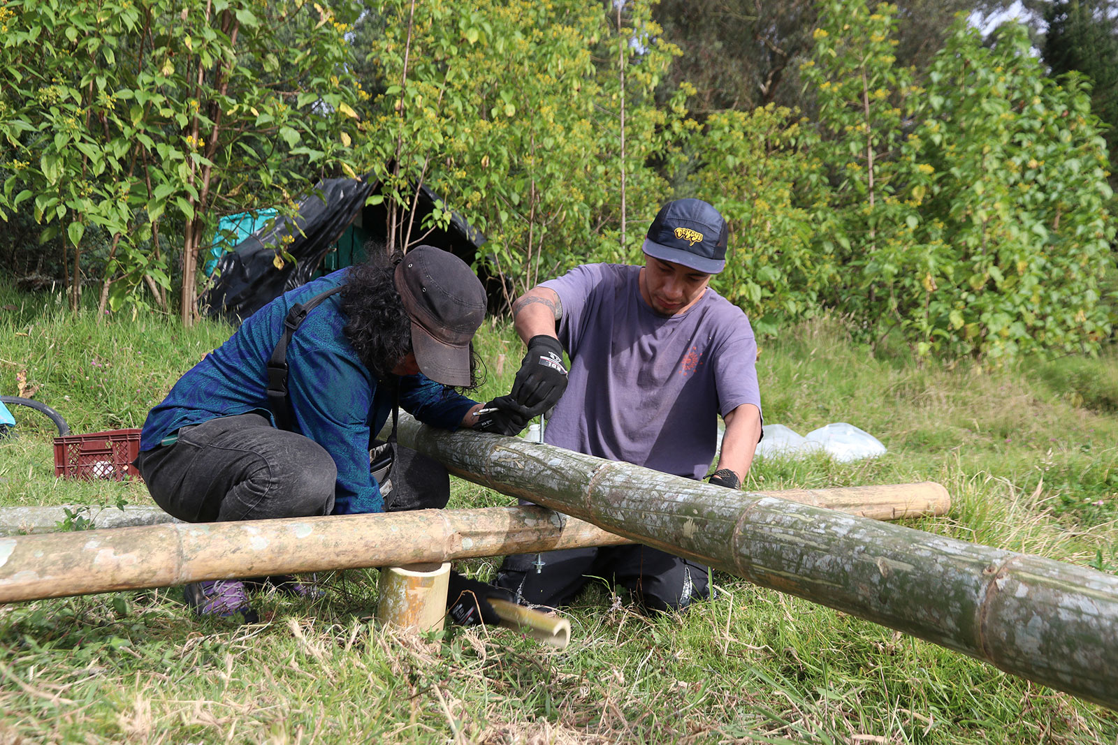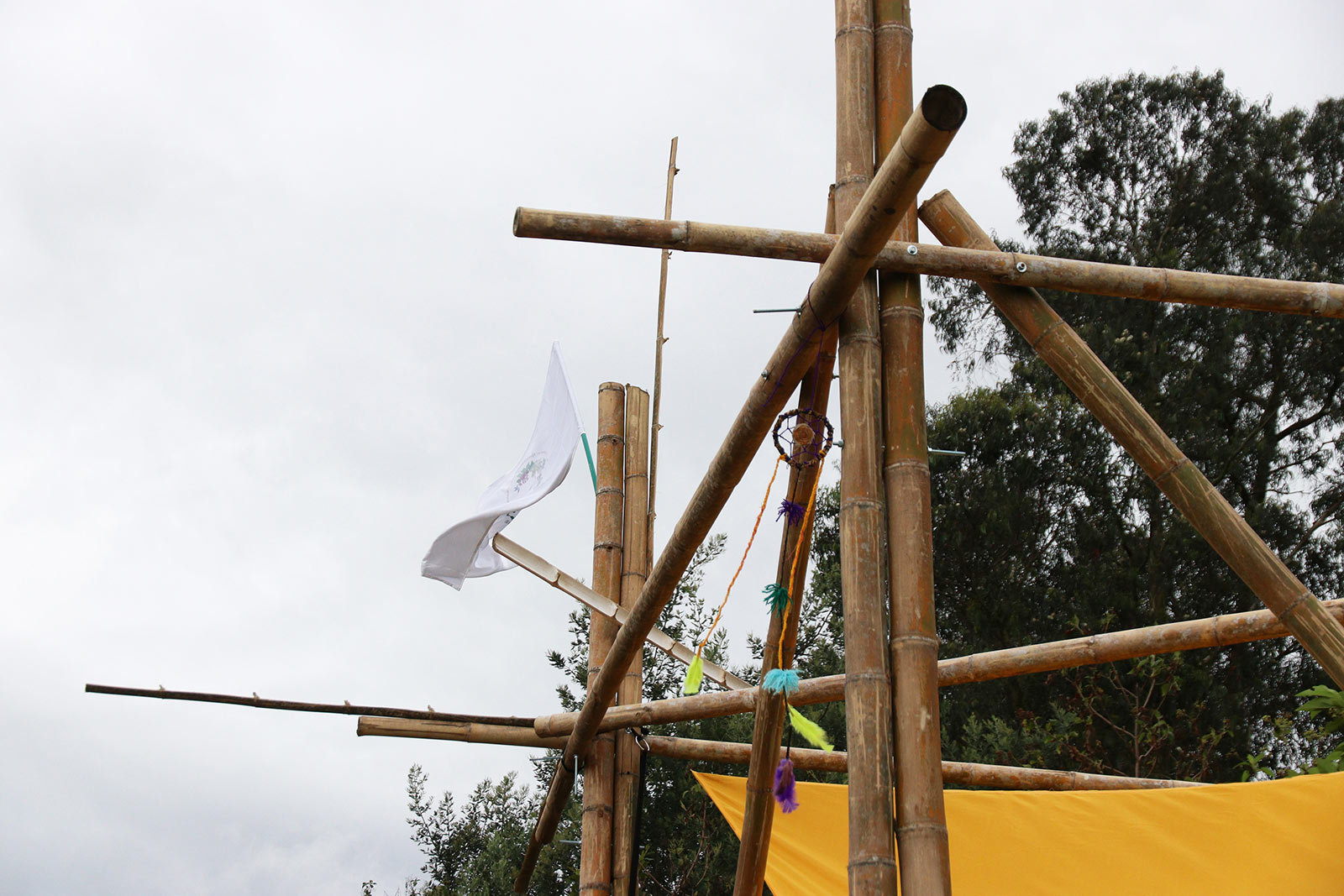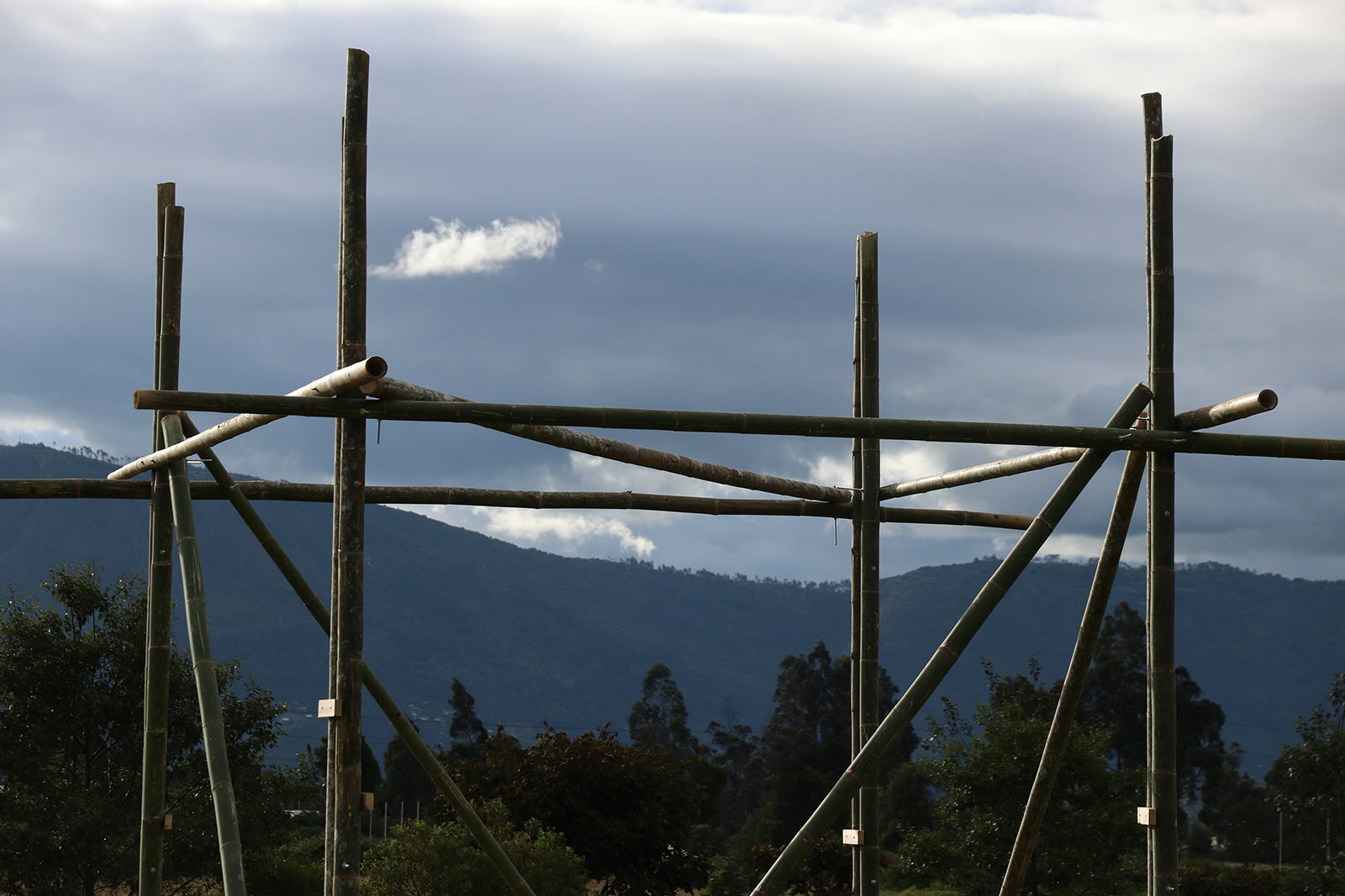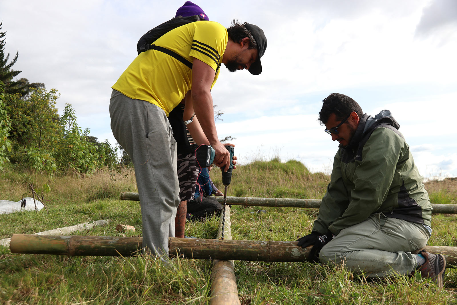 Las perchas fueron codiseñadas durante 1 mes de reuniones y dinámicas participativas, y construidas durante 5 sesiones de trabajo in situ, usando únicamente guadua y madera no tratada, tela semiplástica (que se dispone sólo durante las jornadas de siembra) y varillas roscadas. Las estructuras fueron preensambladas por caras, y elevadas mediante tensores.