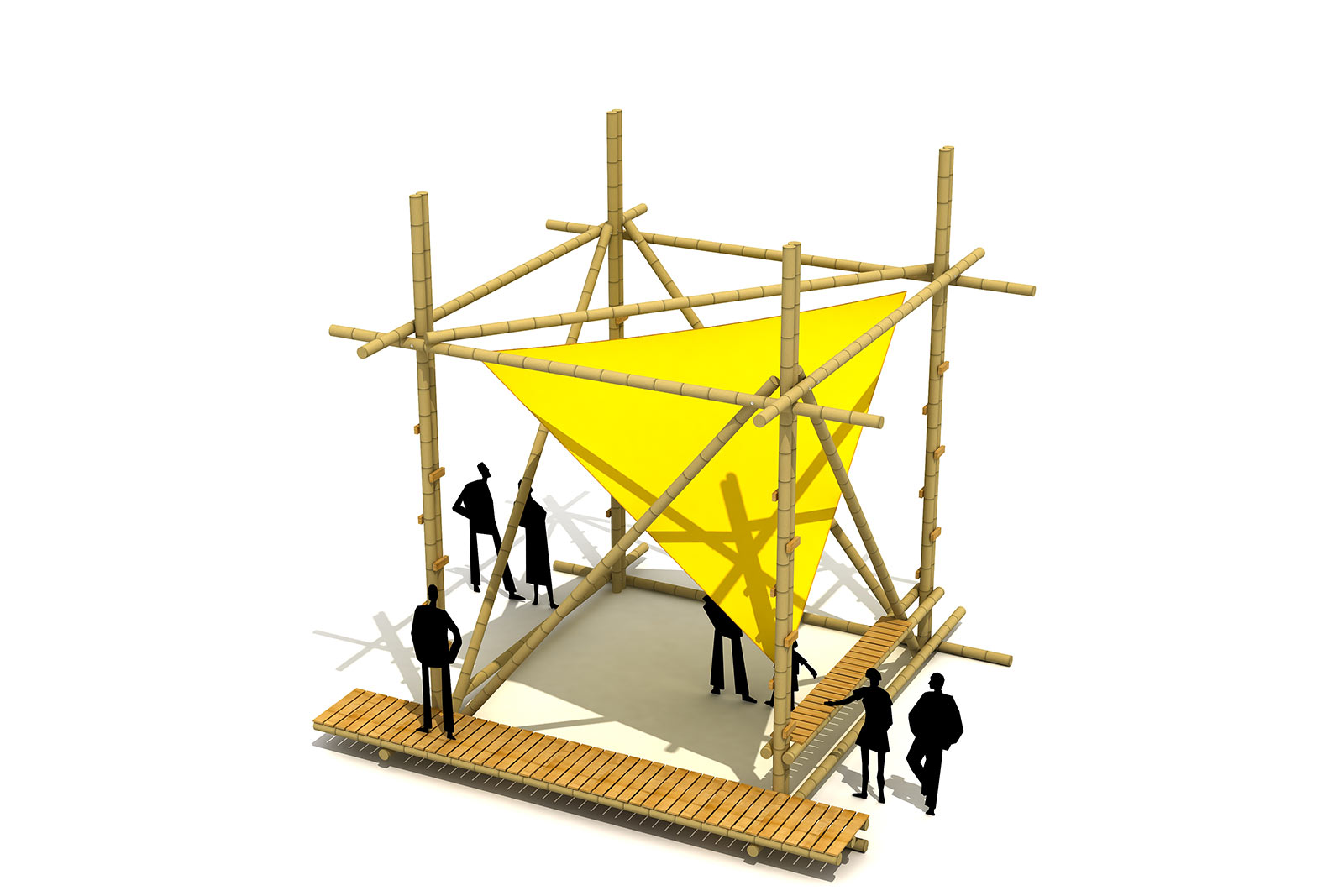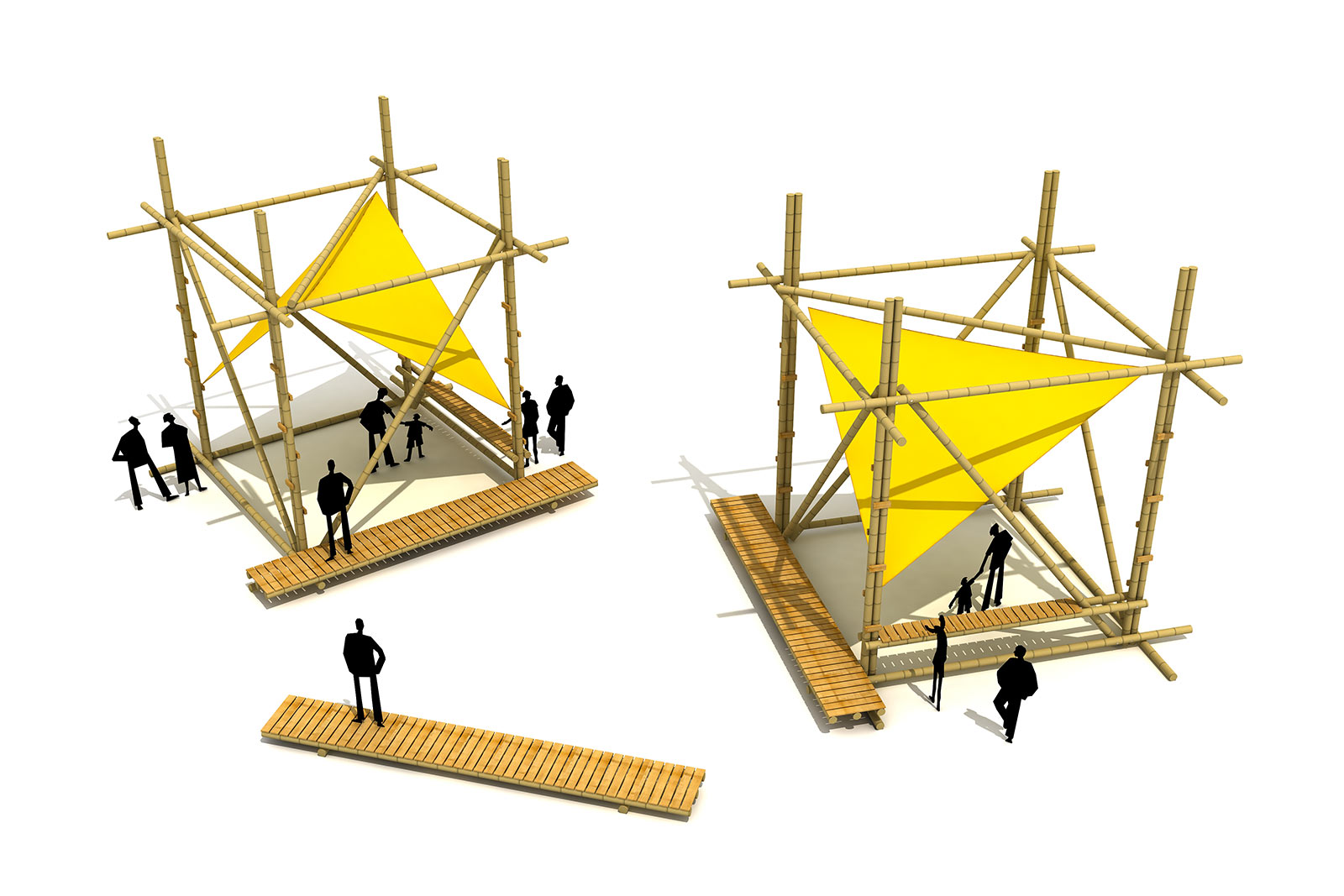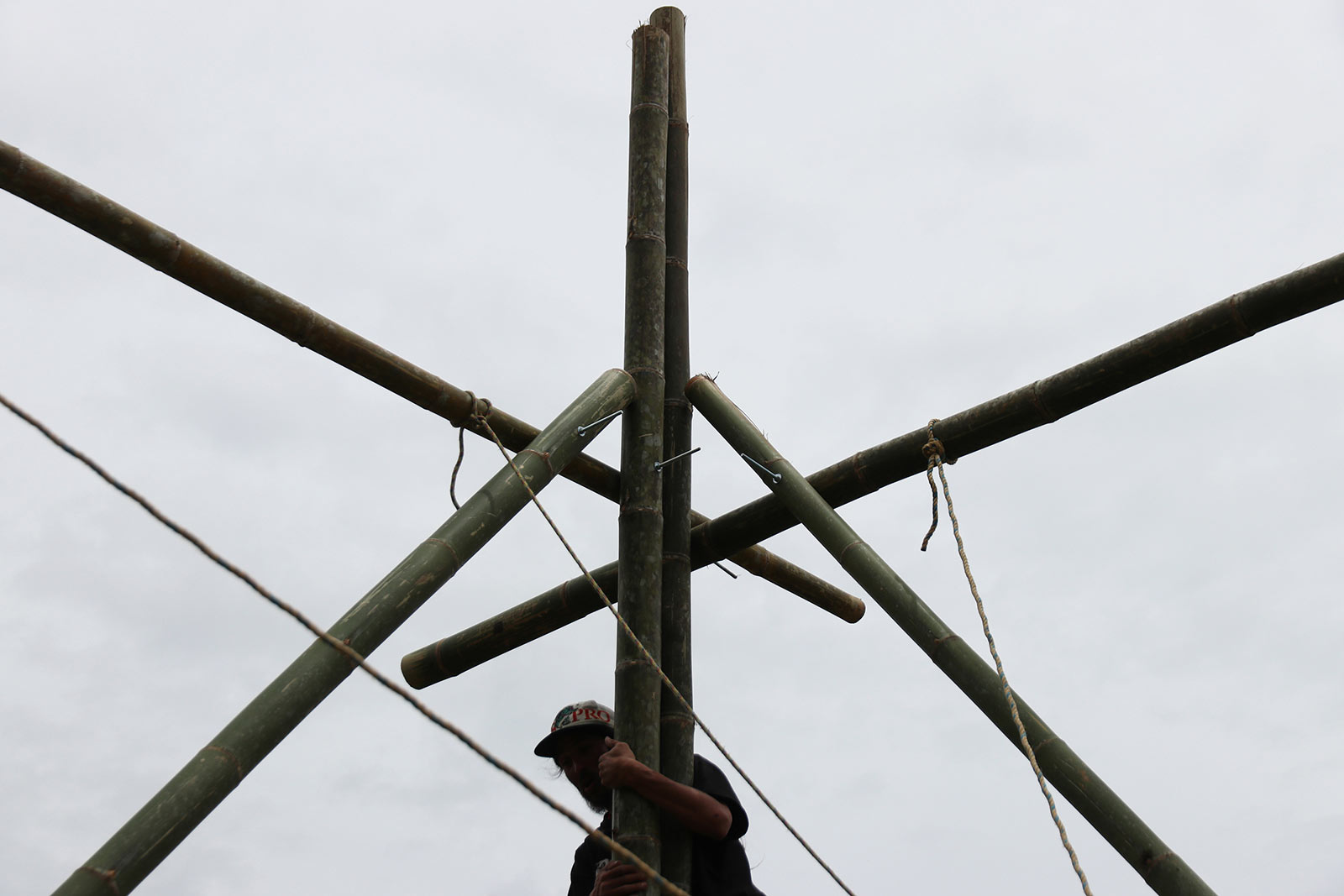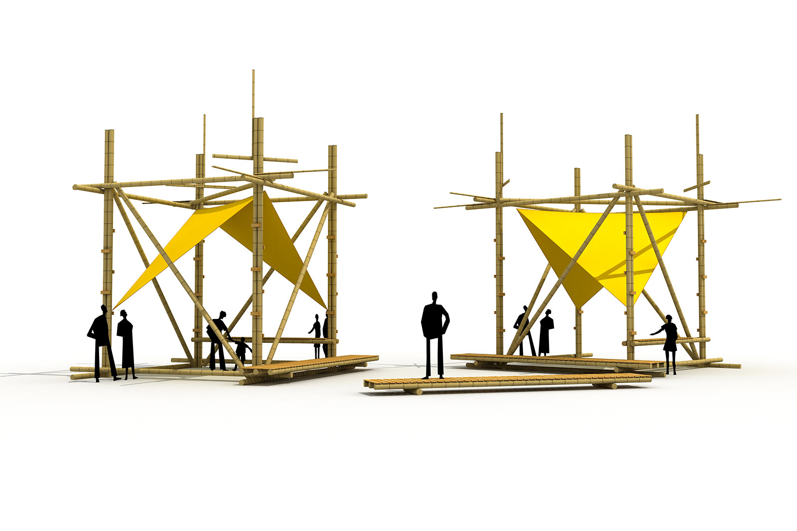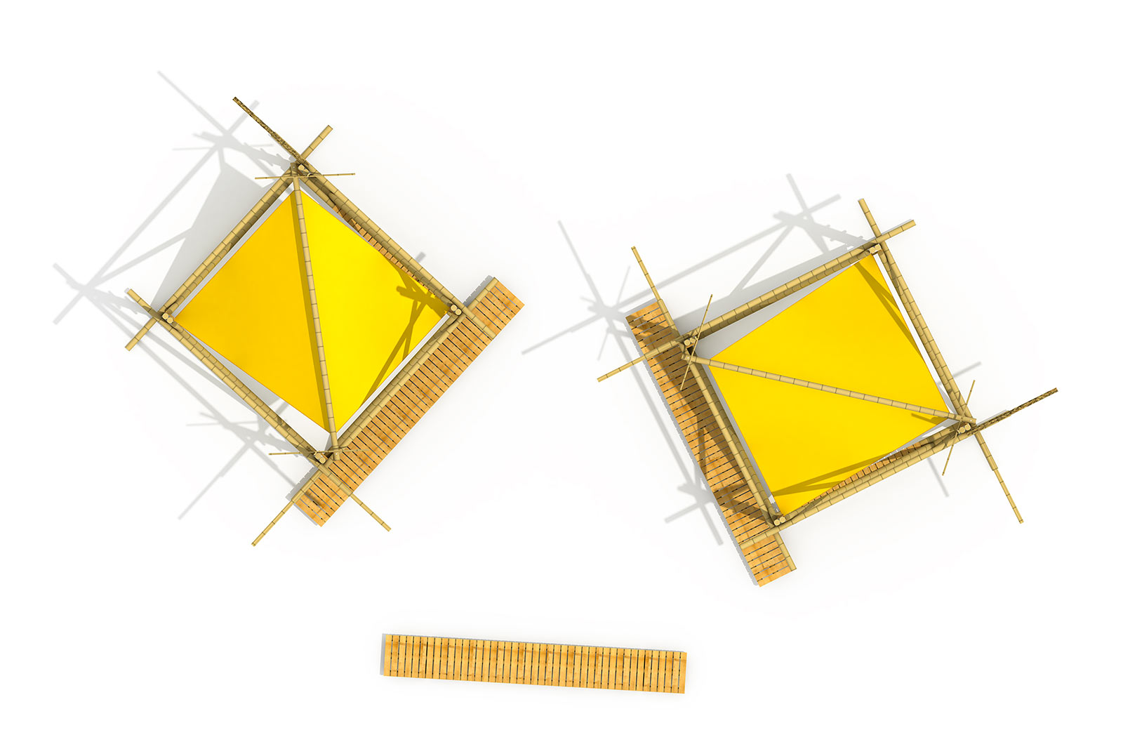Las perchas fueron codiseñadas durante 1 mes de reuniones y dinámicas participativas, y construidas durante 5 sesiones de trabajo in situ, usando únicamente guadua y madera no tratada, tela semiplástica (que se dispone sólo durante las jornadas de siembra) y varillas roscadas. Las estructuras fueron preensambladas por caras, y elevadas mediante tensores.