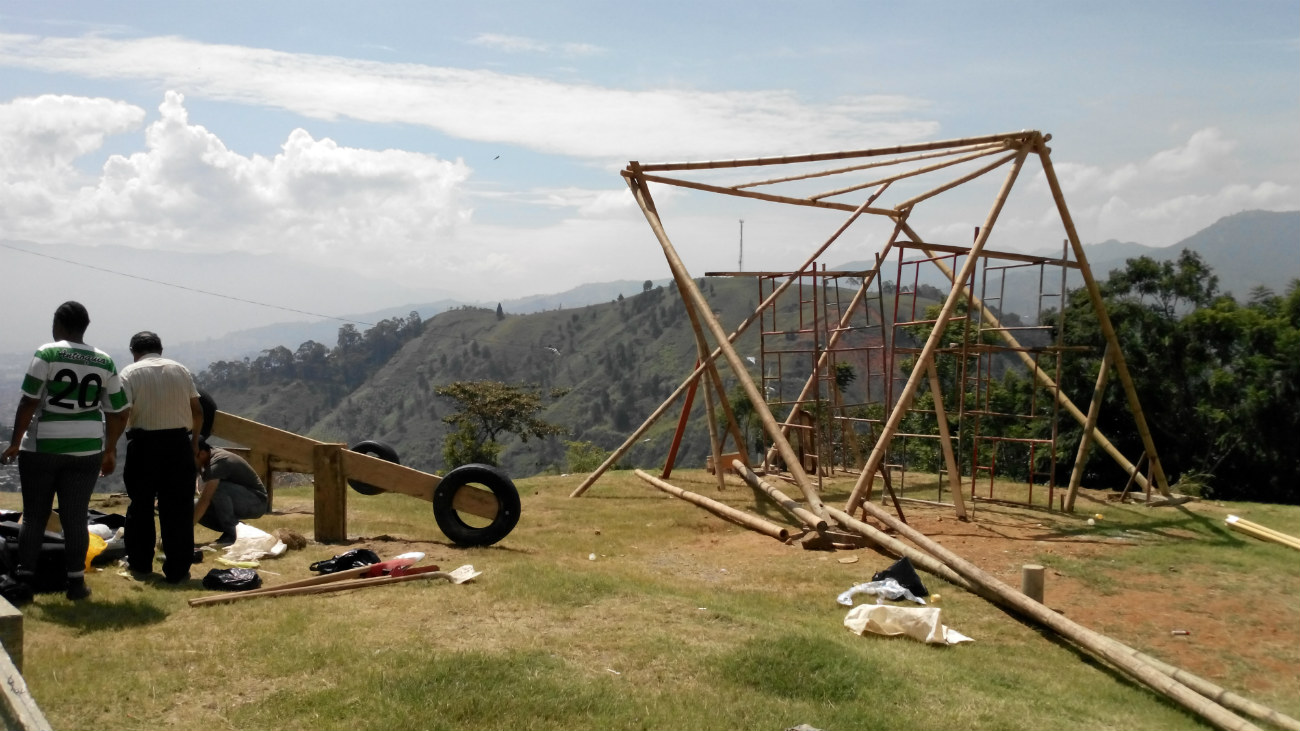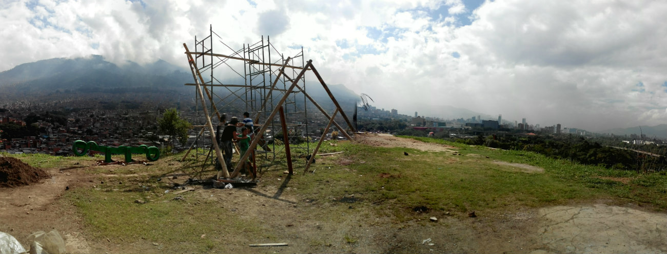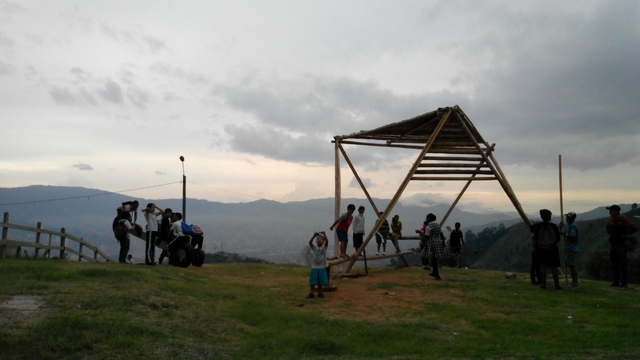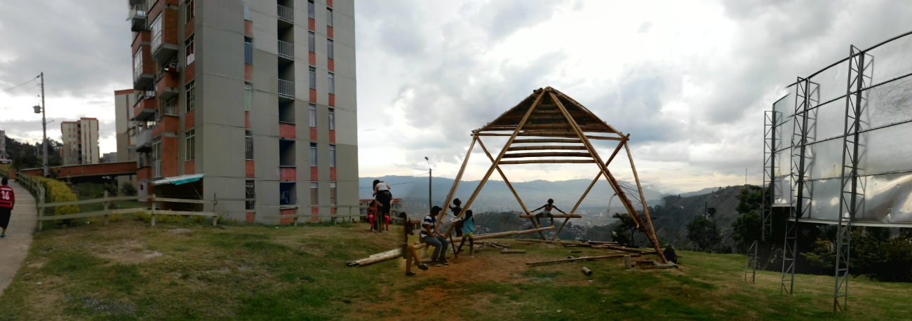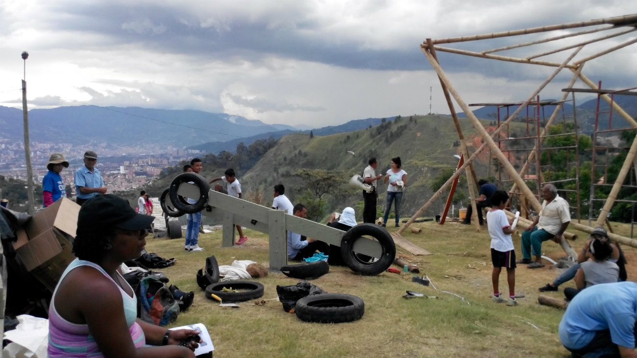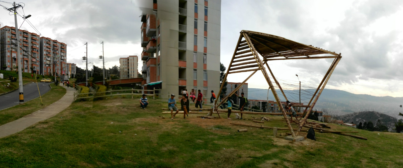 Este proyecto estuvo enmarcado en el encuentro MDE15 -Historias locales/prácticas globales-, organizado por el Museo de Antioquia en noviembre del año 2015. Se trabajó con colectivos locales y vecinos con el objetivo de habilitar un espacio para la reivindicación de los derechos a la ciudad, así como para facilitar la construcción de dos espacios comunes para vecinos: de lugar de sombra, encuentro y juego en los barrios Ciudadela Nuevo Occidente y Moravia, ambos en Medellín. La alcaldía, que aparentemente avalaba el proyecto, lo destruyó echando abajo el espacio construido en Moravia, a machetazos y a primera hora de la mañana, cuando no había vecinos que lo pudiesen defender.