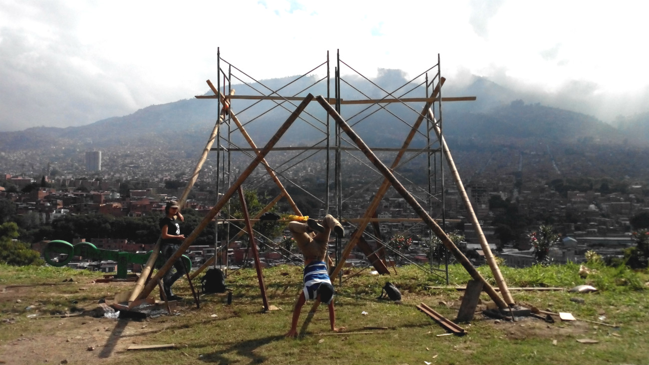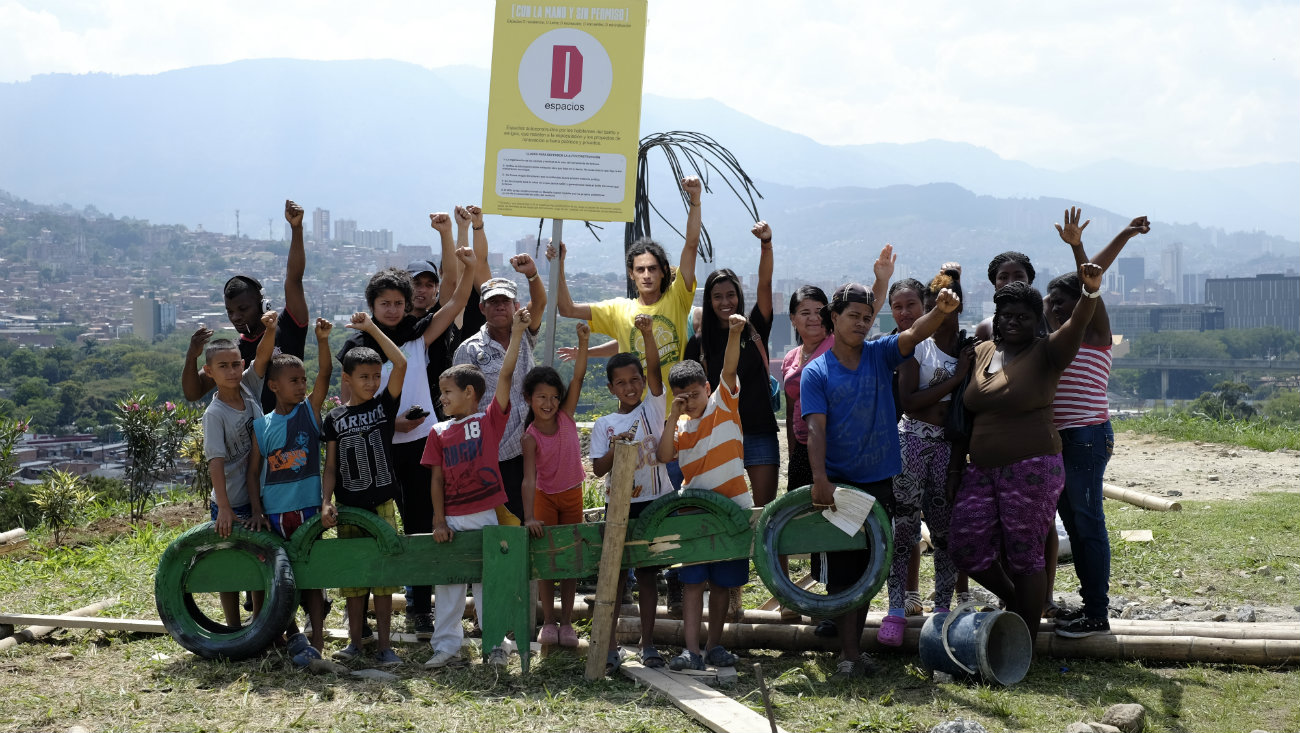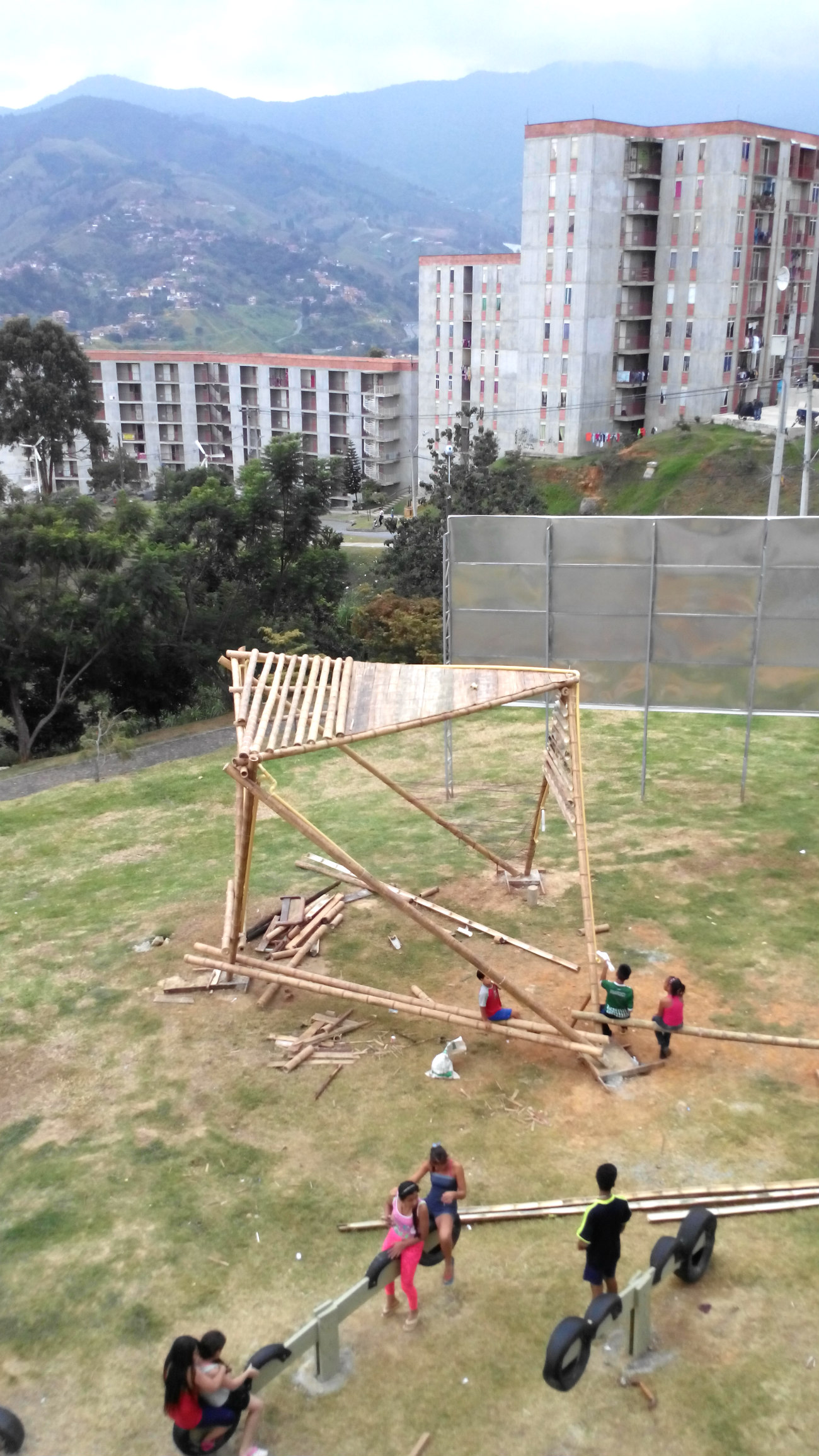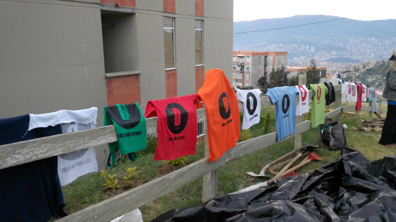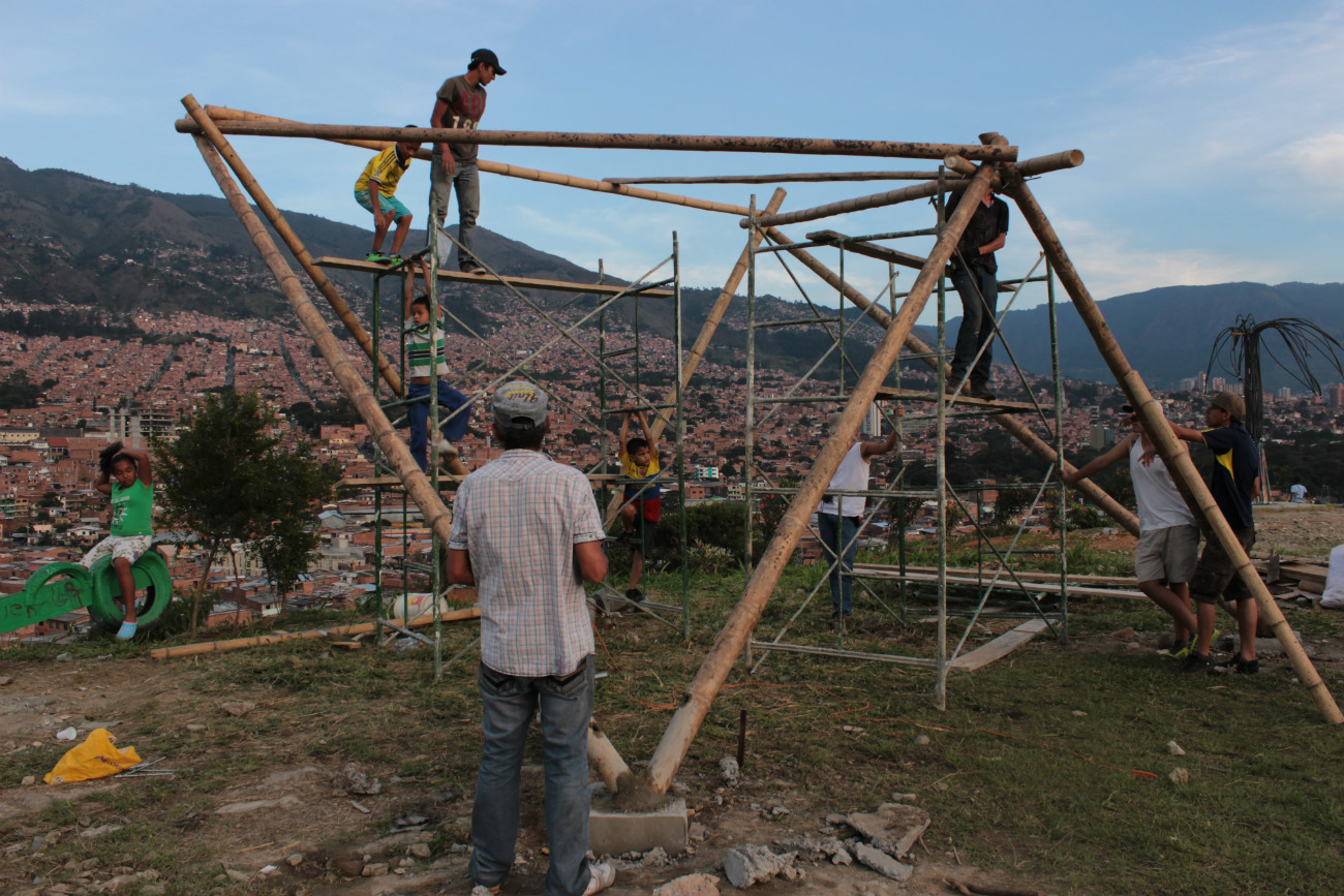 Este proyecto estuvo enmarcado en el encuentro MDE15 -Historias locales/prácticas globales-, organizado por el Museo de Antioquia en noviembre del año 2015. Se trabajó con colectivos locales y vecinos con el objetivo de habilitar un espacio para la reivindicación de los derechos a la ciudad, así como para facilitar la construcción de dos espacios comunes para vecinos: de lugar de sombra, encuentro y juego en los barrios Ciudadela Nuevo Occidente y Moravia, ambos en Medellín. La alcaldía, que aparentemente avalaba el proyecto, lo destruyó echando abajo el espacio construido en Moravia, a machetazos y a primera hora de la mañana, cuando no había vecinos que lo pudiesen defender.