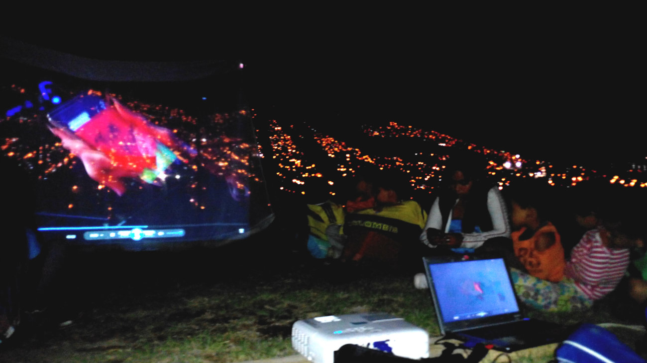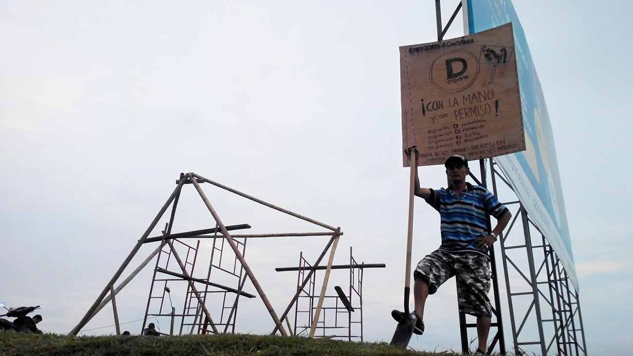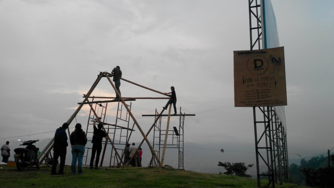 Las condiciones de construcción estuvieron dadas por la implementación de materiales económicos, por la ligereza de la estructura en guadua y por sencillas técnicas de montaje que facilitarían la participación de los vecinos y la replicabilidad en otros territorios. Además de la escogencia estratégica del lugar en el que el dispositivo estaría emplazado, cada estructura estaba acompañada de mataculines[6] y una valla que hacía referencia a cinco tácticas para la defensa de la autoconstrucción en el territorio. De la mano de la construcción física de los dispositivos, se realizarían activaciones culturales que hablaran de resistencias y apropiación desde la serigrafía, el esténcil, las proyecciones de cine y las sesiones de la escuela interbarrial en defensa del territorio.