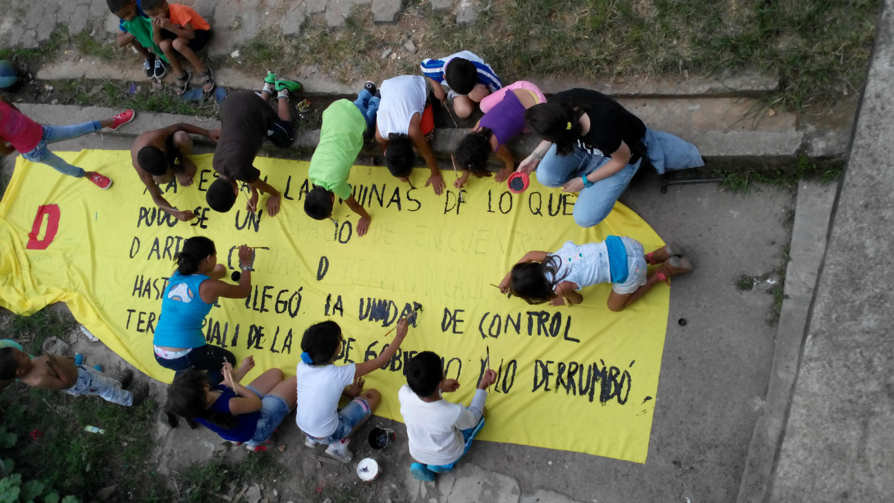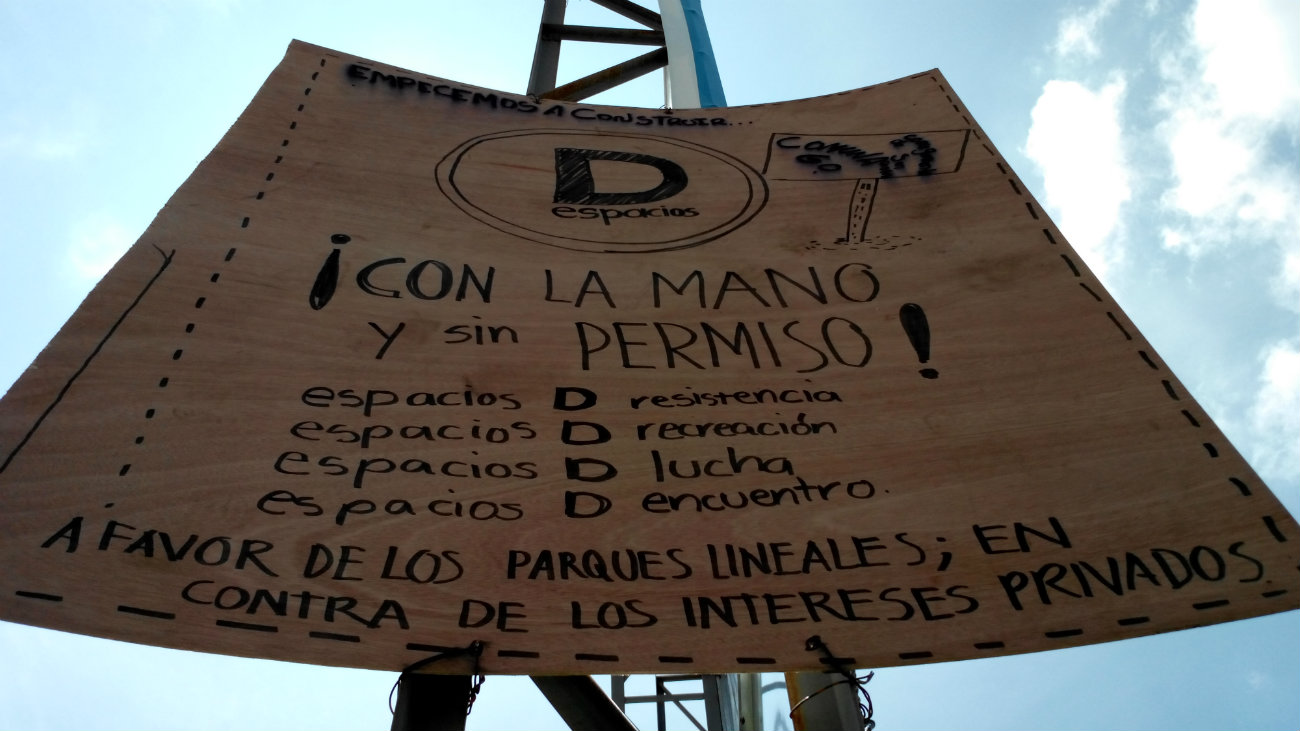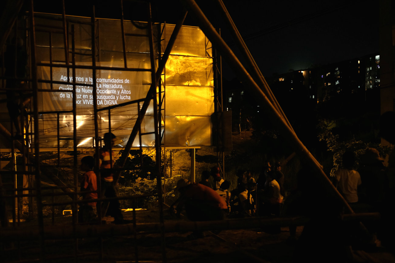 Se decide construir 2 prototipos-provocadores [3] que, a partir de su uso y diversos modos de apropiación ciudadana, visibilizarían las formas de organización en defensa del territorio a través de tomas culturales: asambleas de la escuela en defensa del territorio, proyecciones de cine o simplemente para encontrarse a la sombra. Pretendía ser también una galería a cielo abierto donde fuese posible compartir la información y documentación referente al fuerte impacto que los proyectos de renovación urbana han tenido y siguen teniendo en los habitantes de los territorios afectados.
