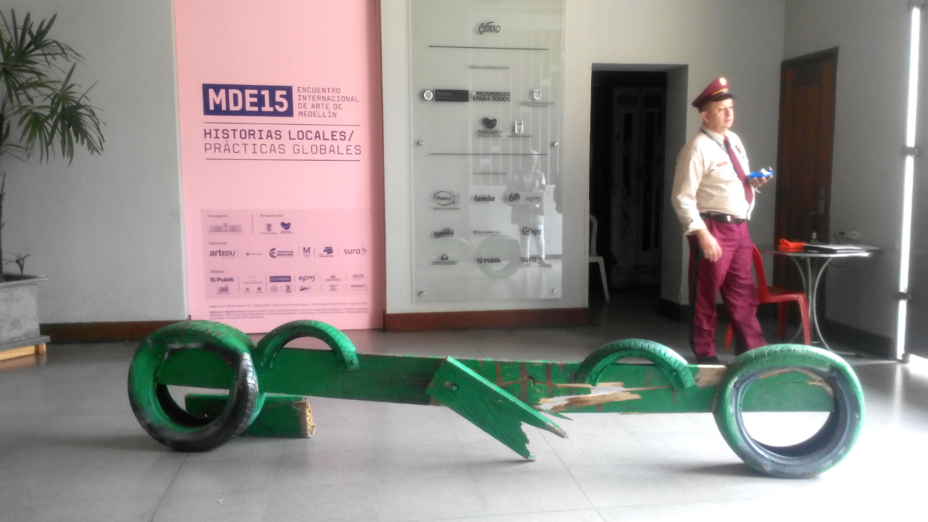 El sube-baja destrozado a machetazos fue expuesto en el museo de Antioquia en el marco del MDE. No es un ejercicios simbólico de representación de la violencia, son los restos literales de una violencia institucional que es sistemática contra comunidades una y mil veces vulneradas en un país marcado por el desplazamiento del campo a la ciudad, ahora de la mano del gobierno municipal mediante el desplazamiento intraurbano.